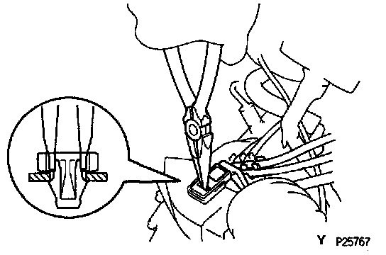- Using needle-nose pliers, disconnect the cord clamp from the engine wire protector.