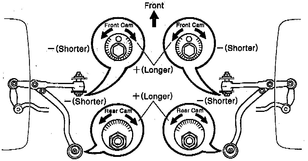 - Camber adjustment should be done on the No.1 adjusting cam. After adjusting the camber, inspect the caster and toe-in.