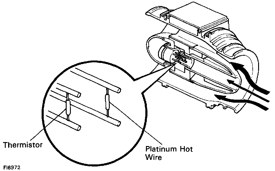 The mass air flow meter uses a platinum hot wire. The hot wire air flow meter consists of a platinum hot wire, thermistor and a control circuit installed in a plastic housing. The hot wire air flow meter works on the principle that the hot wire and thermistor located in the intake air bypass of the housing detect any changes in the intake air temperature.