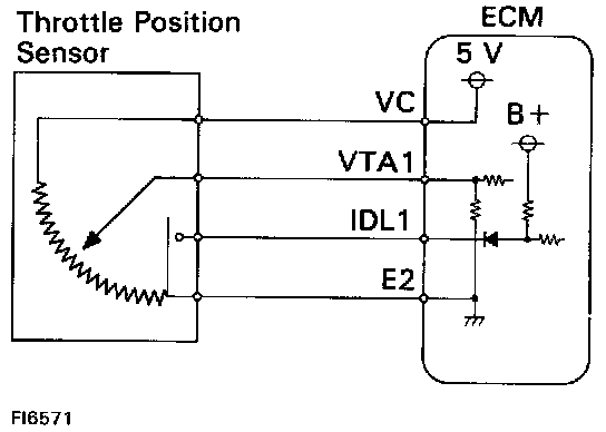 The throttle position sensor is mounted in the throttle body and detects the throttle valve opening angle. When the throttle valve is fully closed, the IDL contacts in the throttle position sensor are on, so the voltage at the terminal IDL1 of the ECM becomes 0 V. At this time, a voltage of 0.3 ~ 0.8 V is applied to terminal VTA1 of the ECM. When the throttle valve is opened, the IDL contacts go off and thus the power source voltage of approx. 12 V in the ECM is applied to the terminal IDL1 of the ECM. The voltage applied to the terminal VTA1 of the ECM increases in proportion to the opening angle of the throttle valve and becomes 3.2 ~ 4.9 V when the throttle valve is fully opened. The ECM judges the vehicle driving conditions from these signals input from terminals VTA1 and IDL1, and uses them as one of the conditions for deciding the air-fuel ratio correction, power increase correction and fuel-cut control etc.