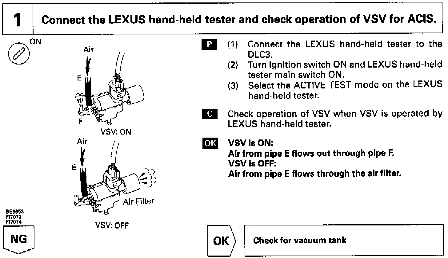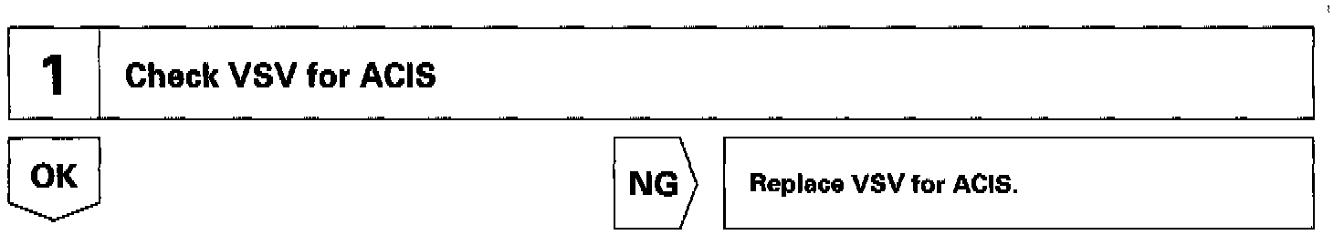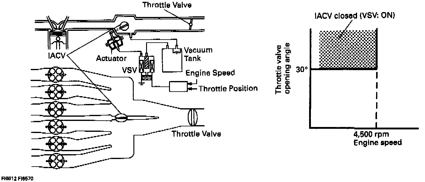 When the engine speed is 4,500 rpm or less and the throttle valve opening angle is 300 or more, the ECM turns the VSV ON and closes the IACV. At all other times, the VSV is OFF, so the IACV is open.