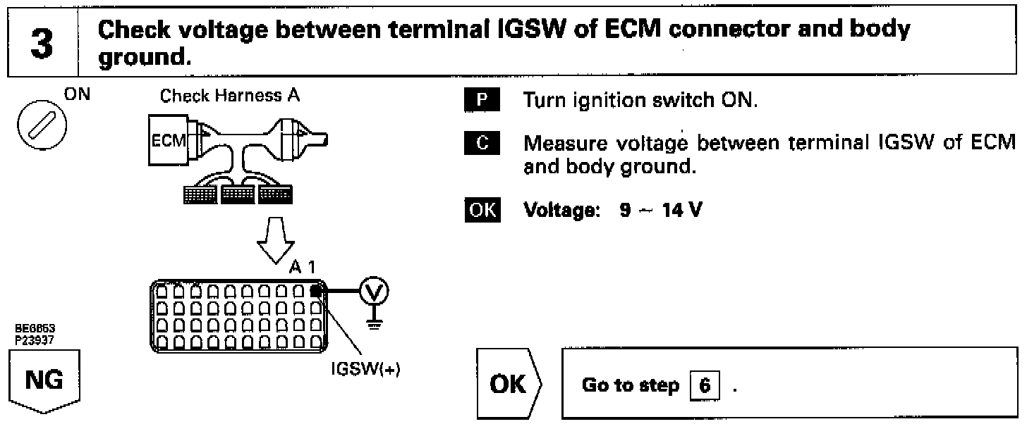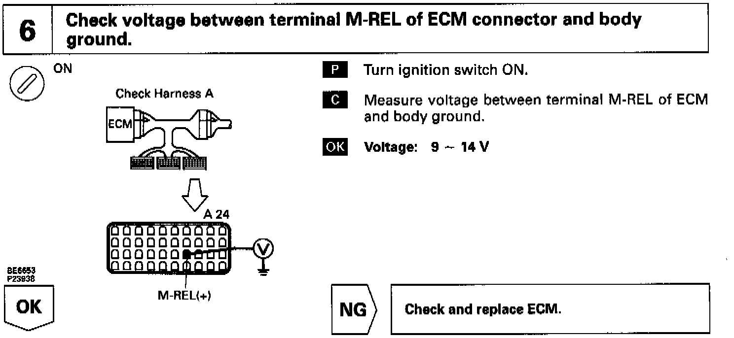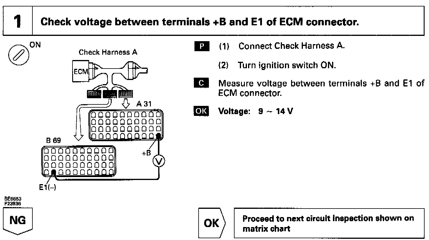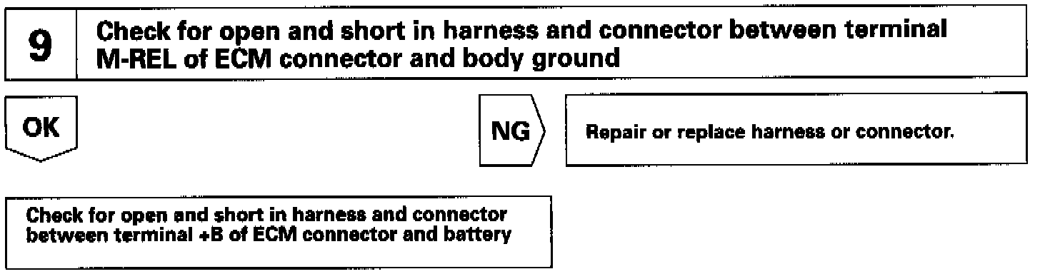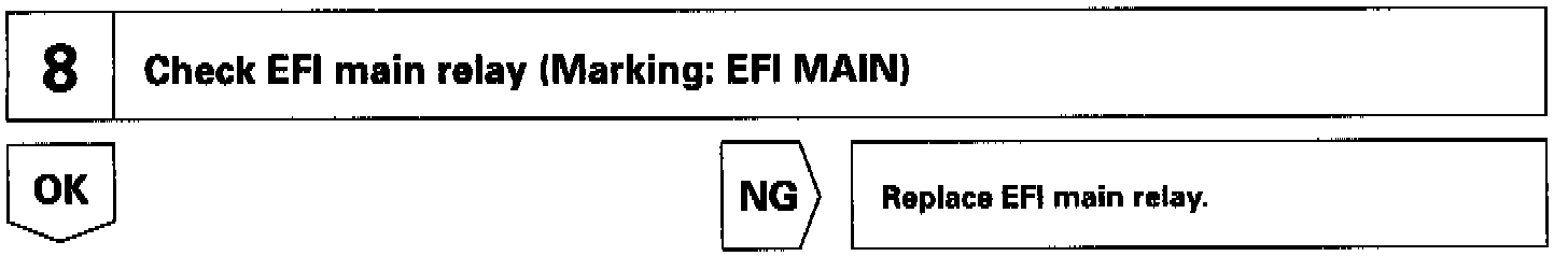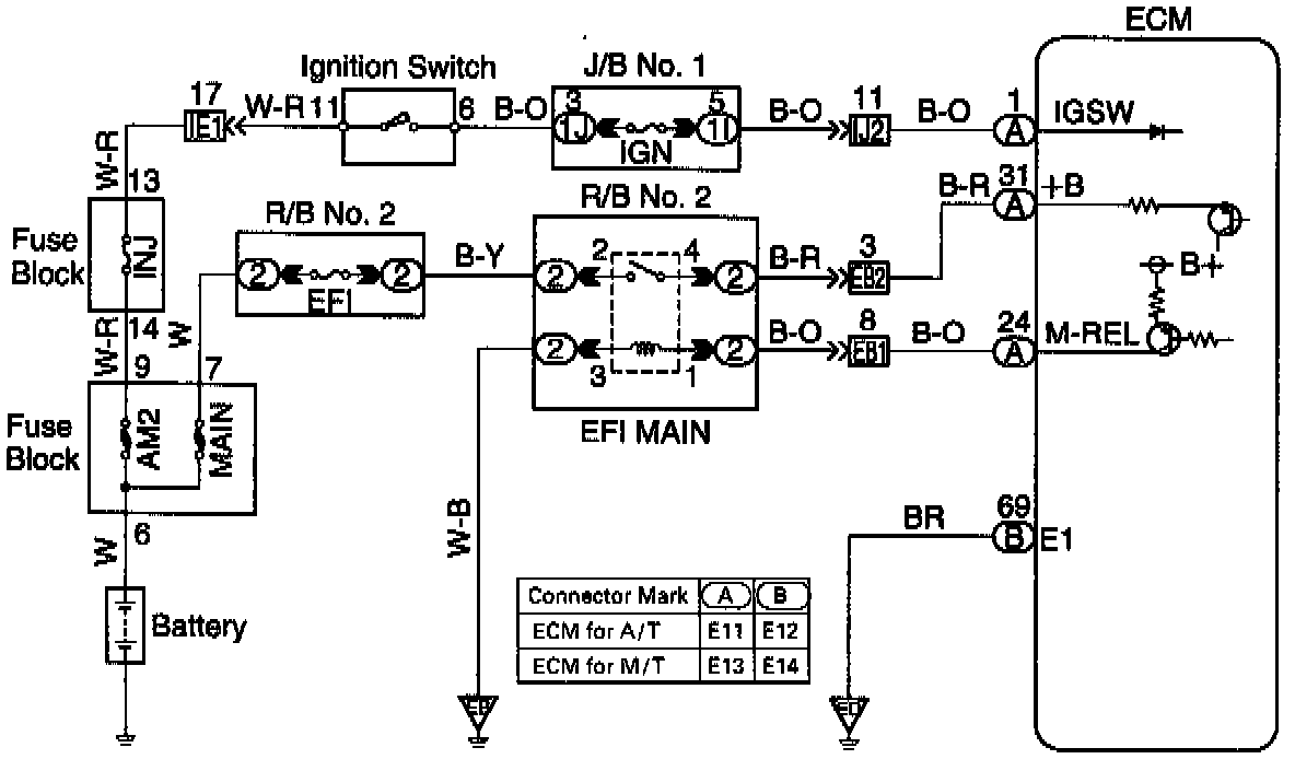 When the ignition switch is turned ON, battery positive voltage is applied to the coil, closing the contacts of the EFI main relay (Marking: EFI MAIN) and supplying power to the terminal +B of the ECM.