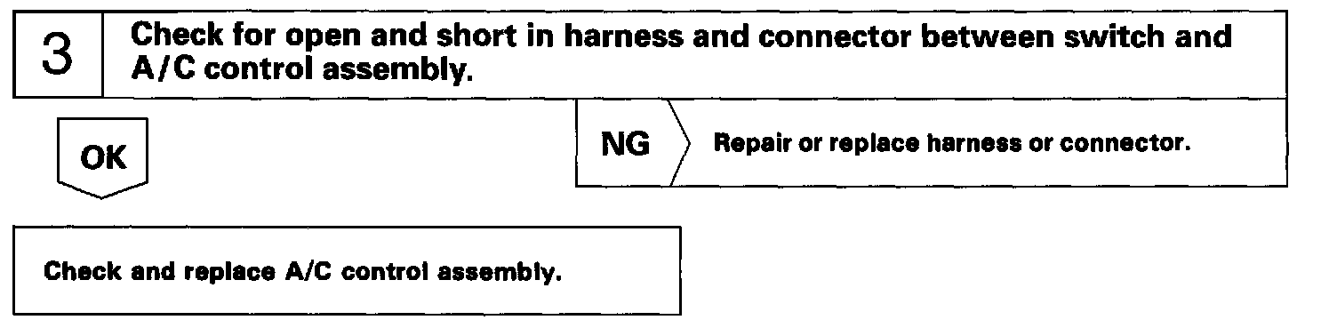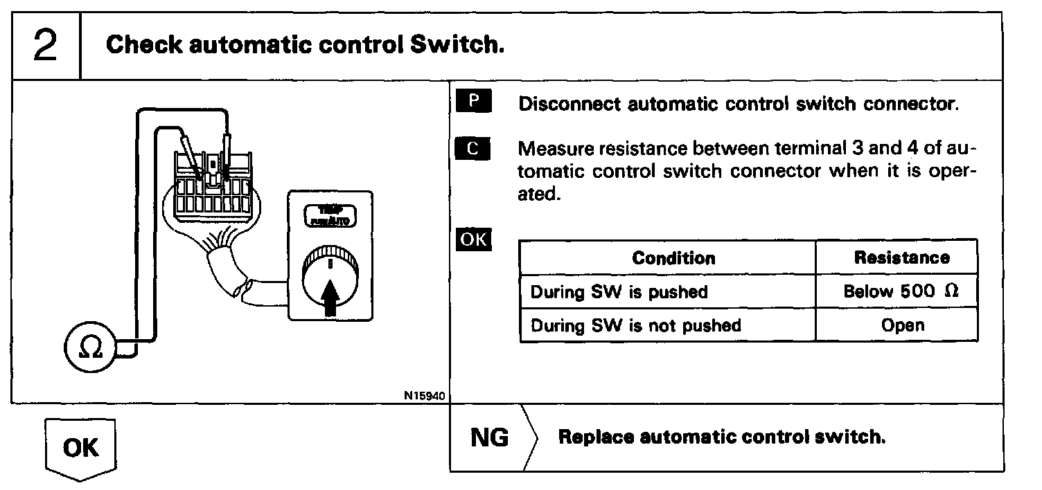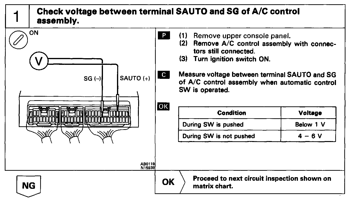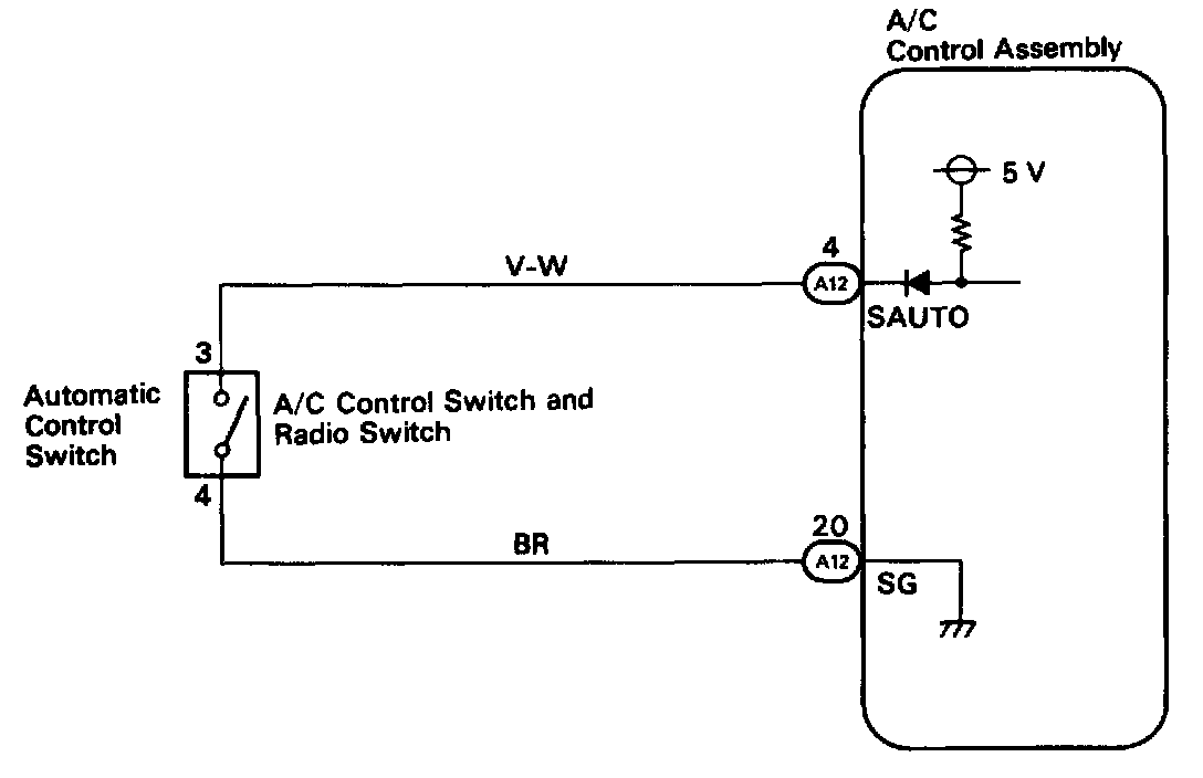 The SW contact is ON while the automatic control SW is pushed, and turns OFF when automatic control SW is released. When the SW is turned ON, the voltage at the SAUTO terminal of A/C control assembly is almost 0 V and the ECU begins fully automatic control of the blower speed, air inlet, air outlet and compressor operation.
