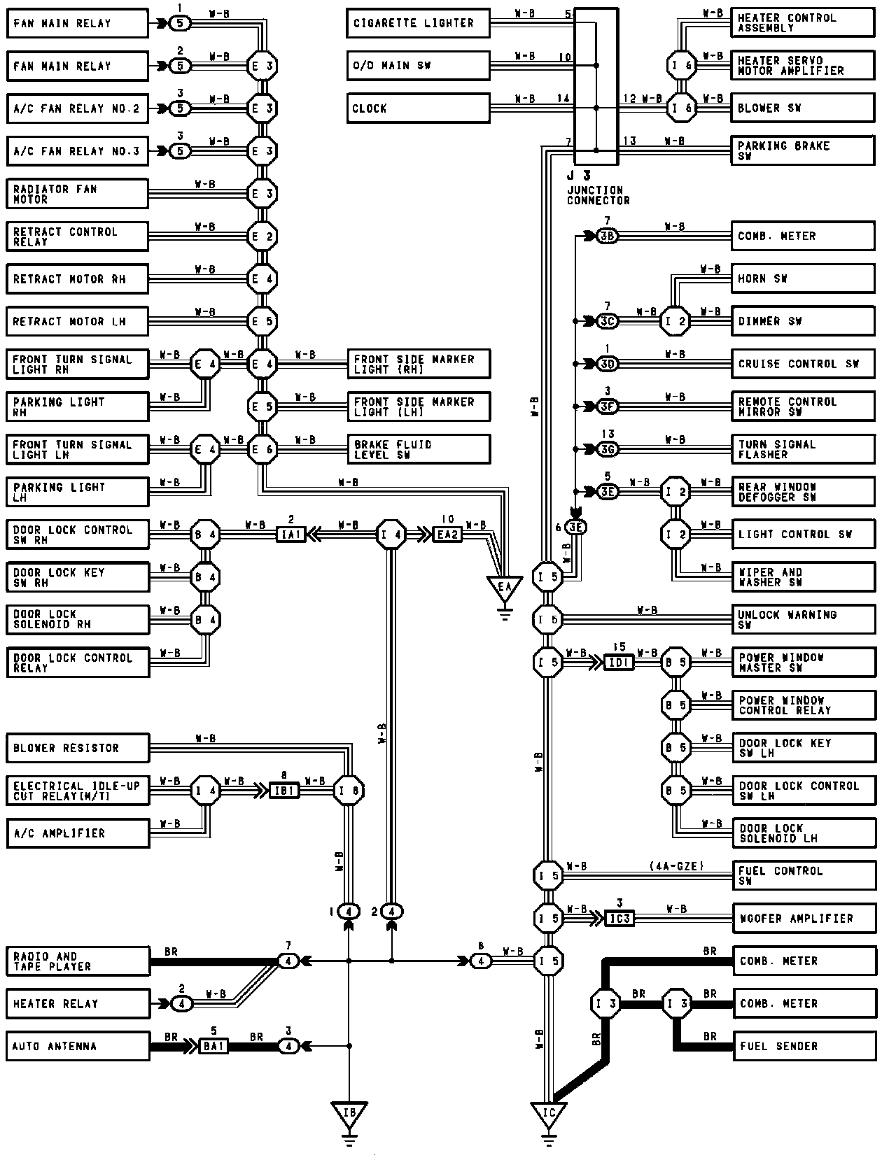 The ground points circuit diagram shows the connections from all major parts to the respective ground points. When troubleshooting a faulty ground point, checking the system circuits which use a common ground may help you identify the problem ground quickly. The relationship between ground points (EA, IB and IC shown below) can also be checked this way.