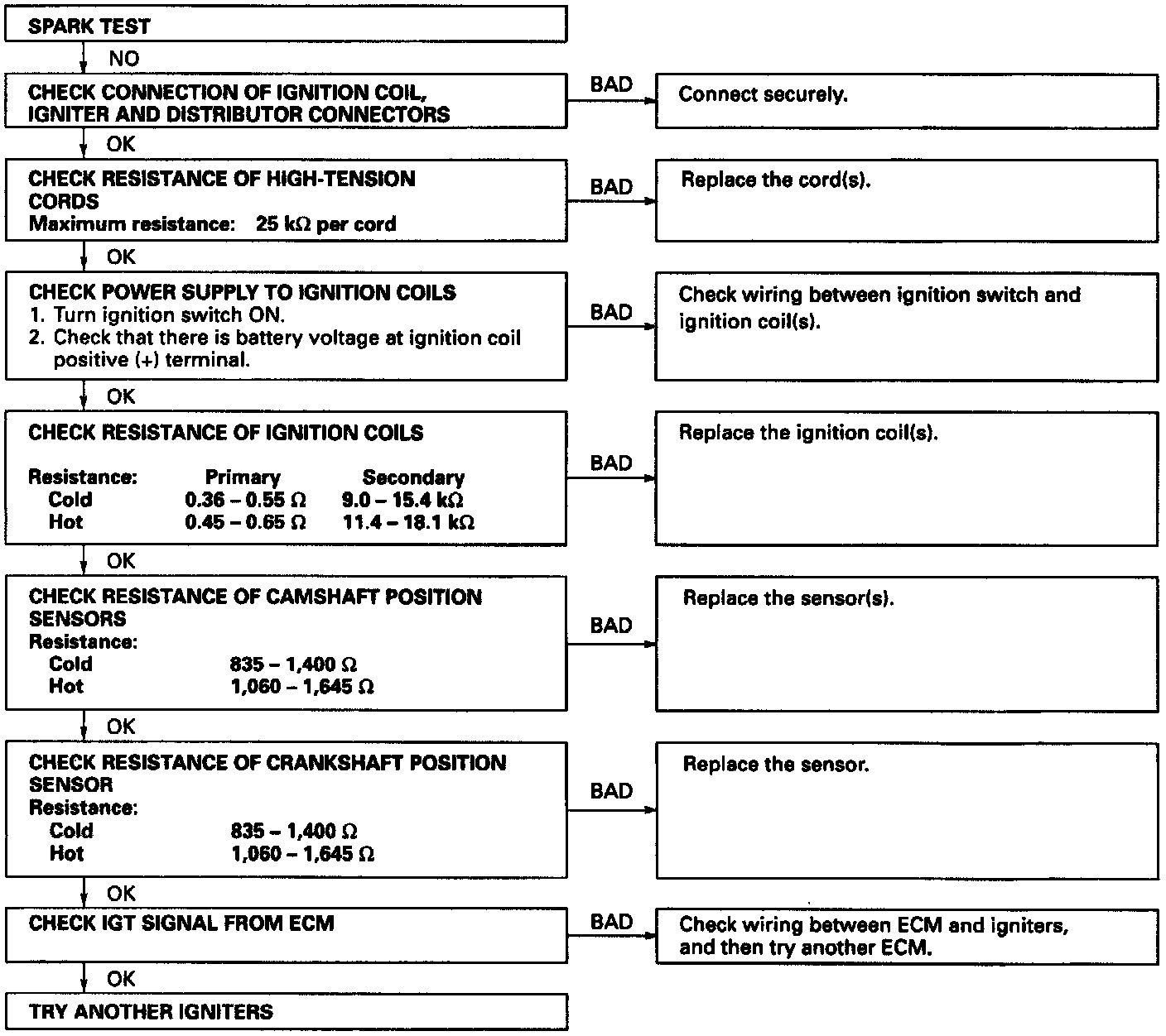 NOTICE: To prevent excess fuel being injected from the injectors during this test, do not crank the engine for more than 5 - 10 seconds at a time. If a spark does not occur. do the test as follows: