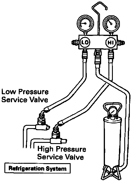 CAUTION: Do not open both high and low hand valves of manifold gauge set.