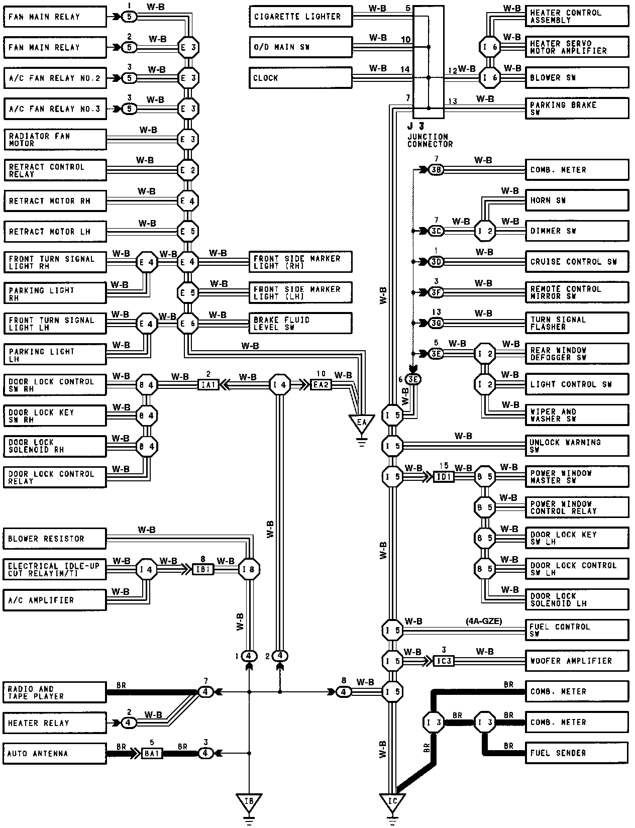 The ground points circuit diagram shows the connections from all major parts to the respective ground points. When troubleshooting a faulty ground point, checking the system circuits which use a common ground may help you identify the problem ground quickly. The relationship between ground points (EA, IB and IC shown below) can also be checked this way.