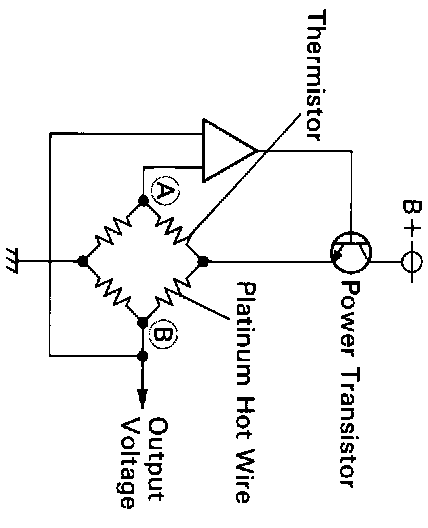 The mass air flow meter uses a platinum hot wire. The hot wire air flow meter consists of a platinum hot wire, thermistor and a control circuit installed in a plastic housing. The hot wire air flow meter works on the principle that the hot wire and thermistor located in the intake air bypass of the housing detect any changes in the intake air temperature.
