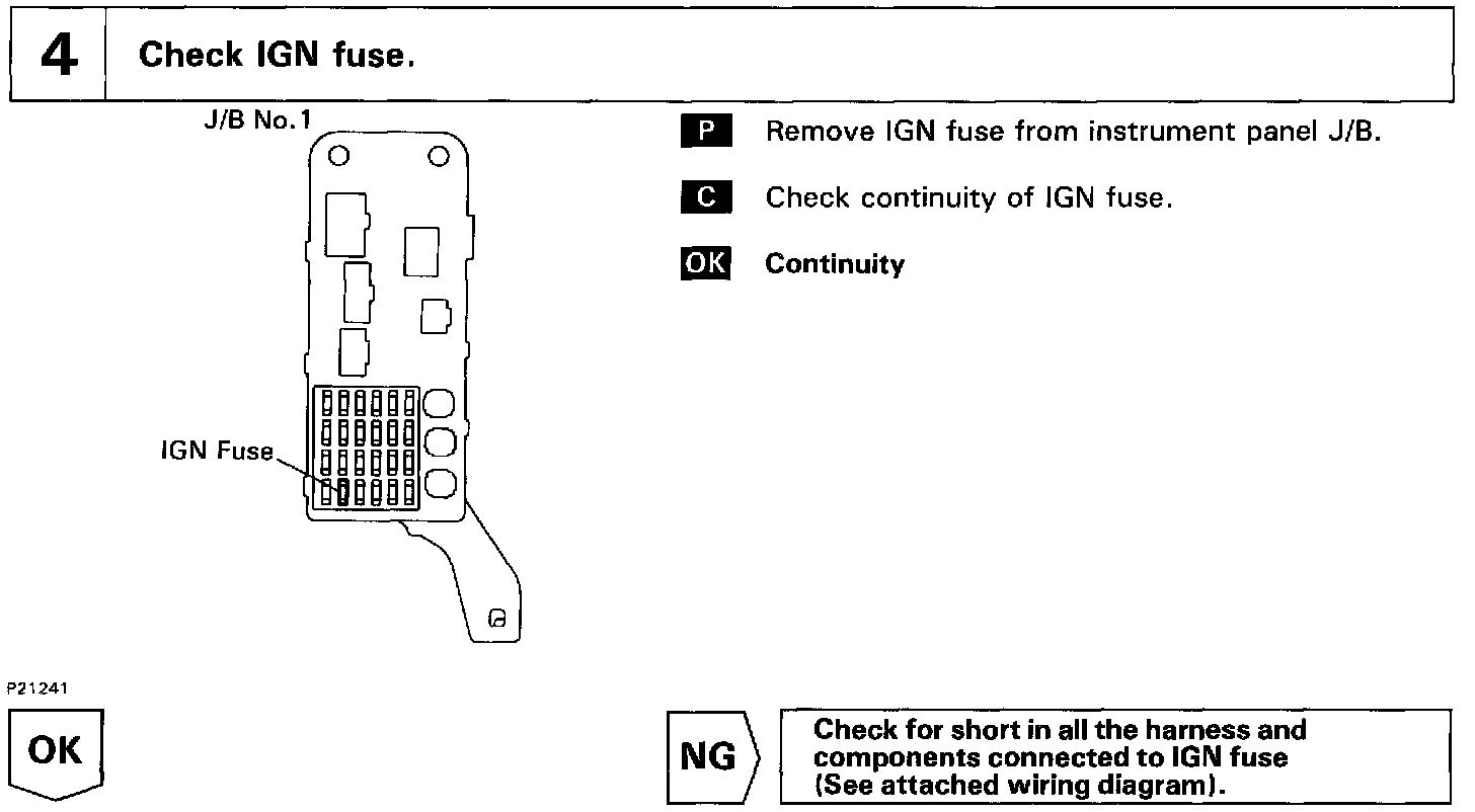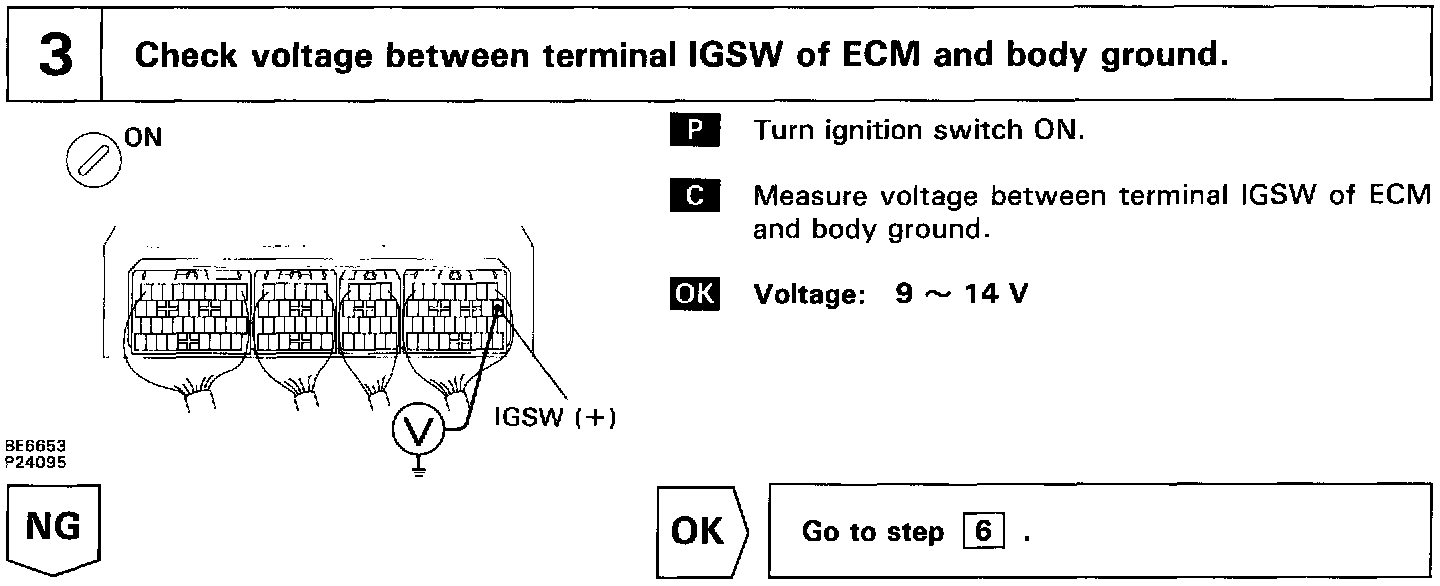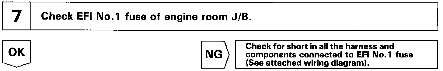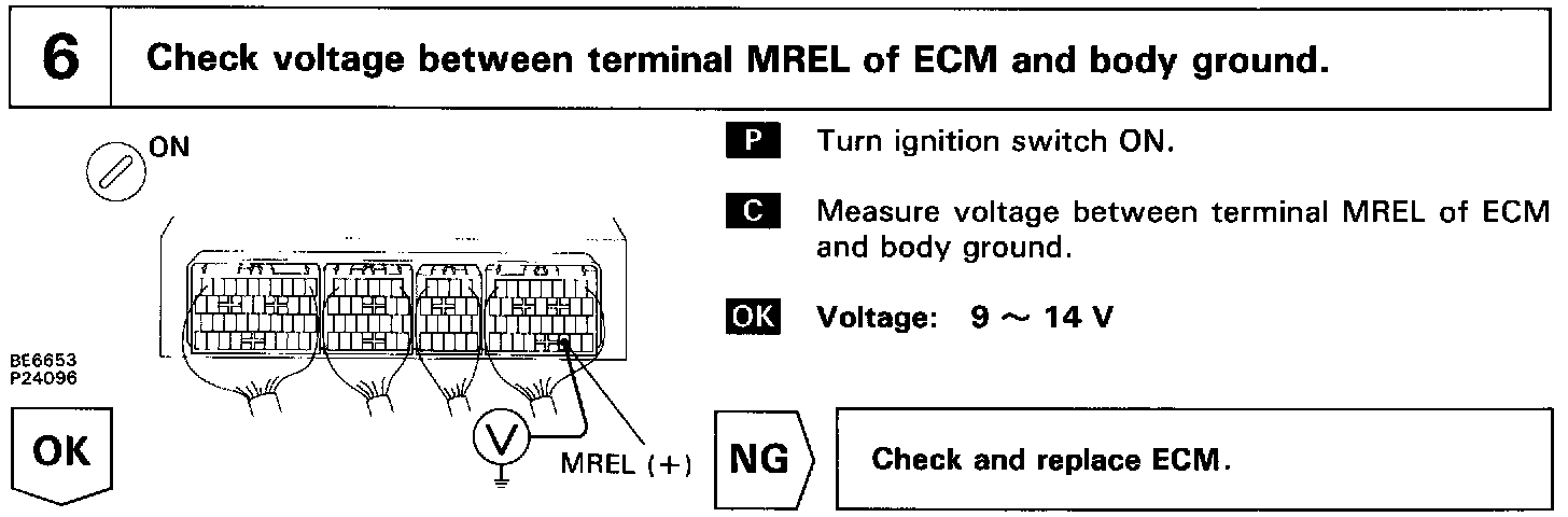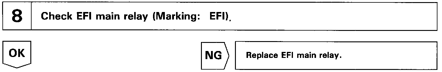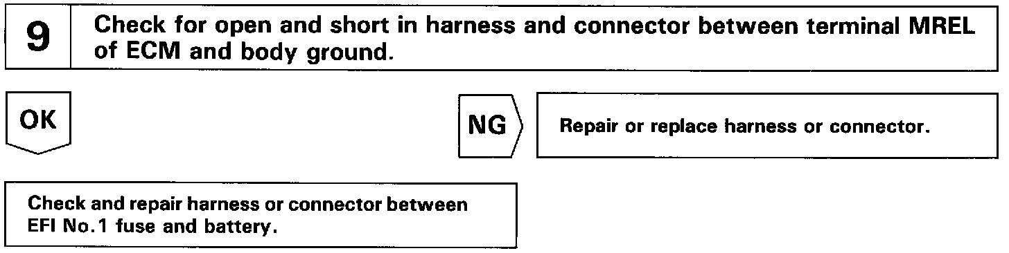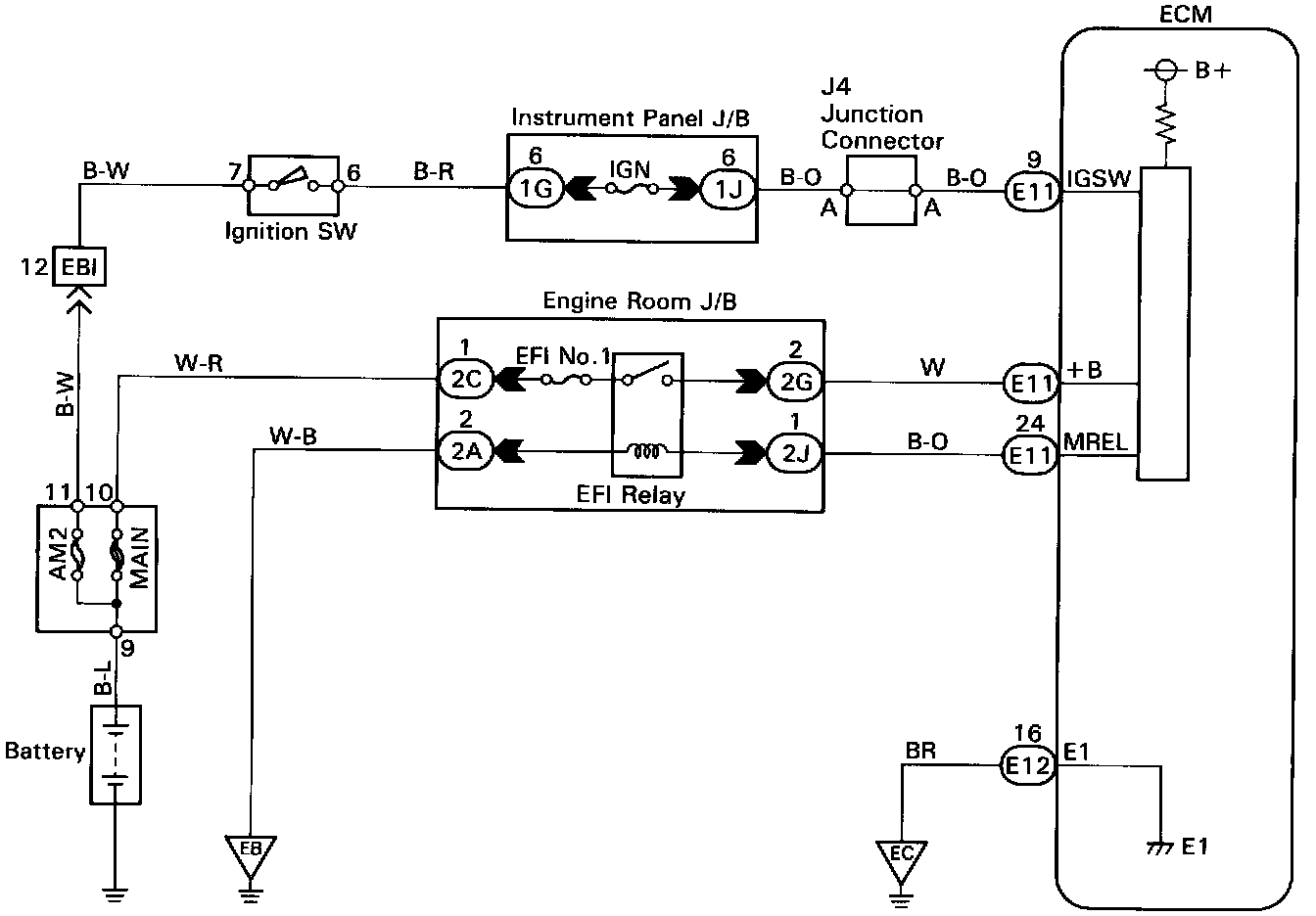 Circuit DescriptionWhen the ignition switch is turned on, battery positive voltage is applied to the terminal IGSW of the ECM and the EFI main relay (Marking: EFI) control circuit in the ECM sends a signal to the terminal MREL of the ECM switching on the EFI main relay.