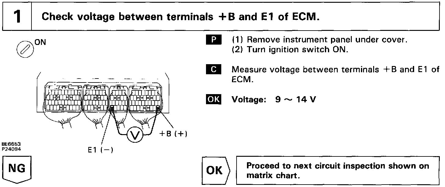 This signal causes current to flow to the coil, closing the contacts of the EFI main relay and supplying power to the terminals +B of the ECM.