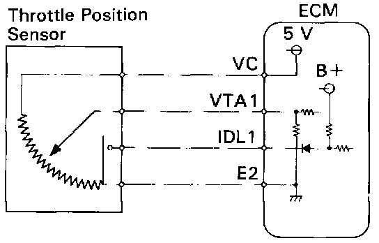 The throttle position sensor is mounted in the throttle body and detects the throttle valve opening angle. When the throttle valve is fully closed, the IDL contacts in the throttle position sensor are on, so the voltage at the terminal IDL1 of the ECM becomes 0 V. At this time, a voltage of 0.3 0.8 V is applied to terminal VTA1 of the ECM. When the throttle valve is opened, the IDL contacts go off and thus the power source voltage of approx. 12 V in the ECM is applied to the terminal IDL1 of the ECM. The voltage applied to the terminal VTA1 of the ECM increases in proportion to the opening angle of the throttle valve and becomes 3.2 ~ 4.9 V when the throttle valve is fully opened. The ECM judges the vehicle driving conditions from these signals input from terminals VTA1 and IDL1 and uses them as one of the conditions for deciding the air-fuel ratio correction, power increase correction and fuel-cut control etc.