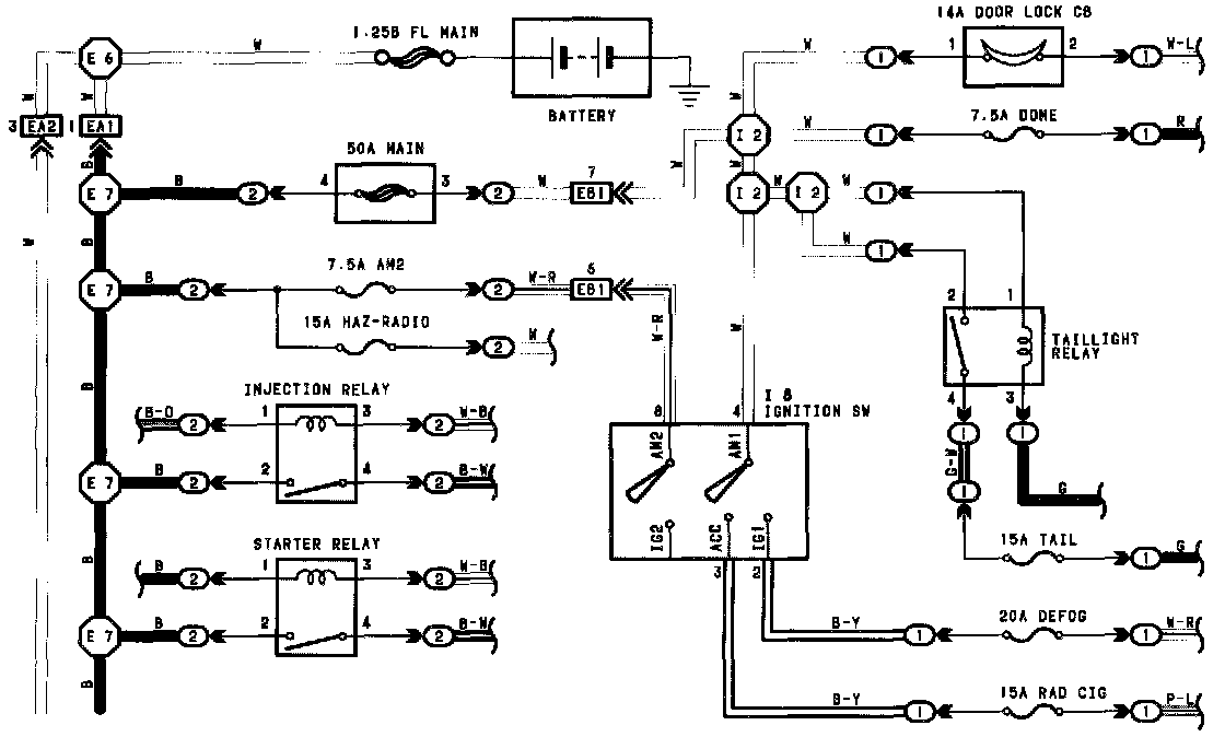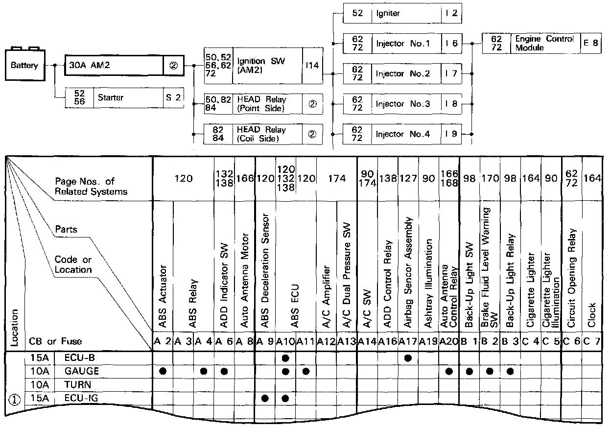 The chart below shows the route by which current flows from the battery to each electric source (Fusible Link, Circuit Breaker, Fuse, etc.) and other parts.