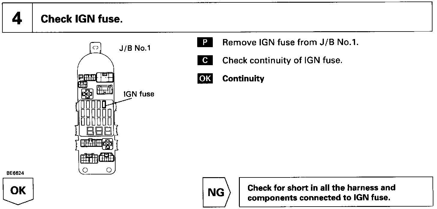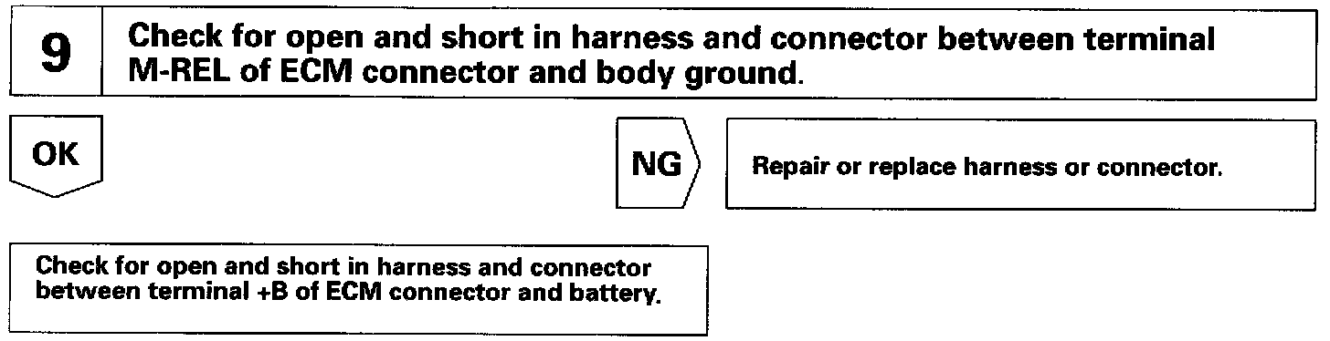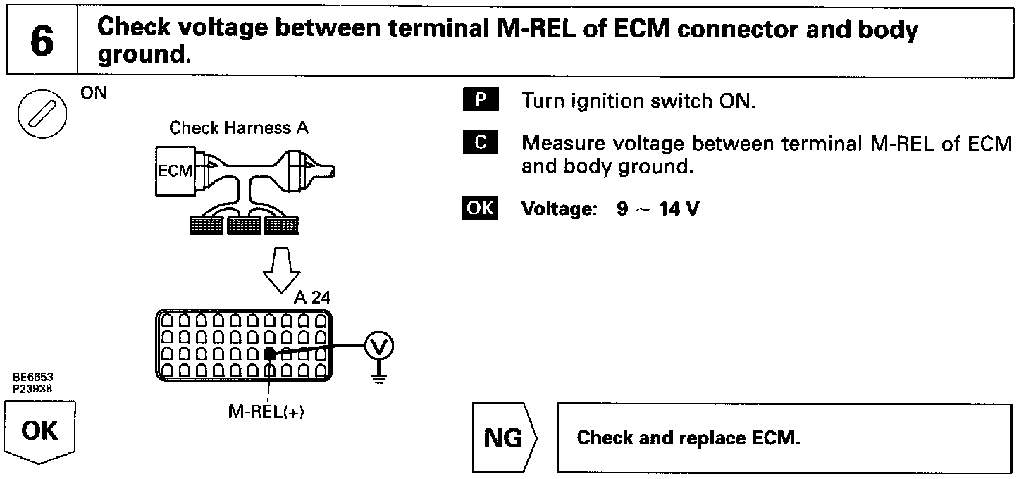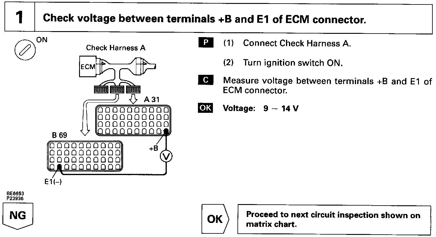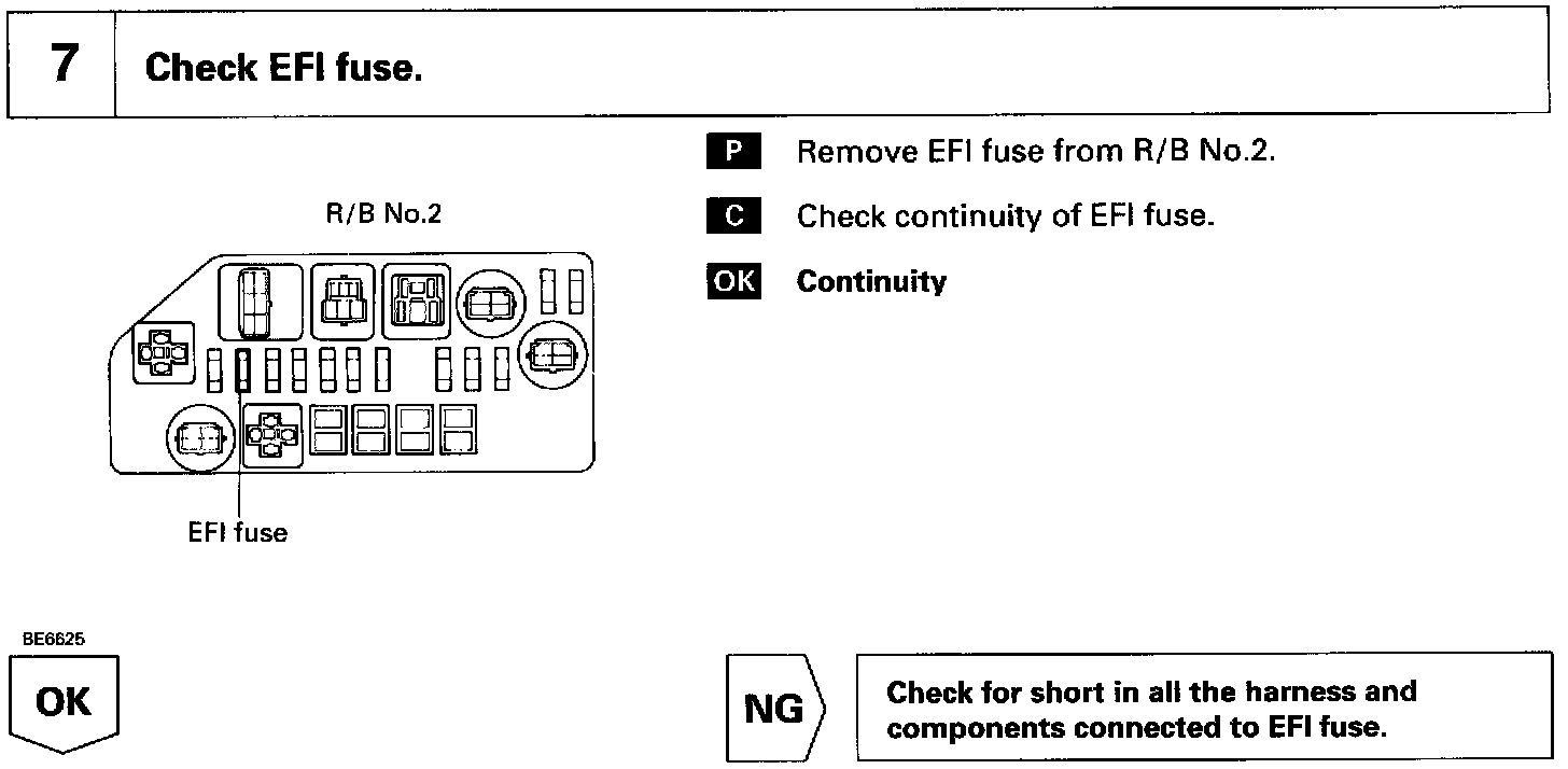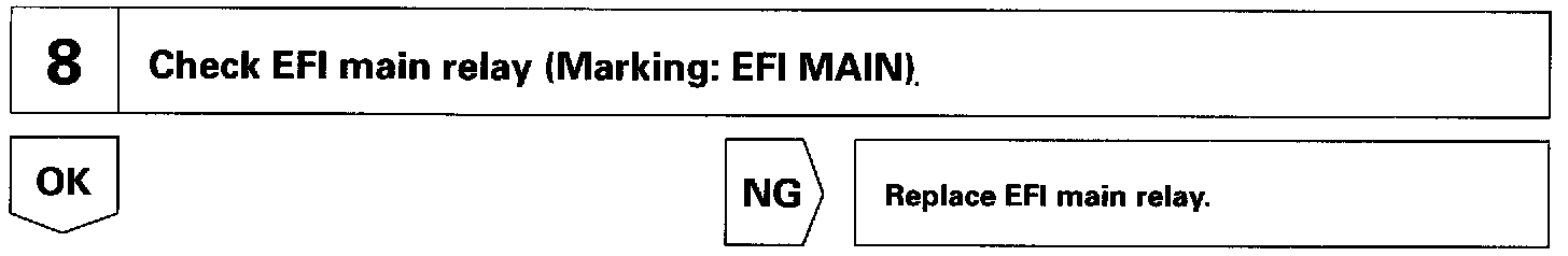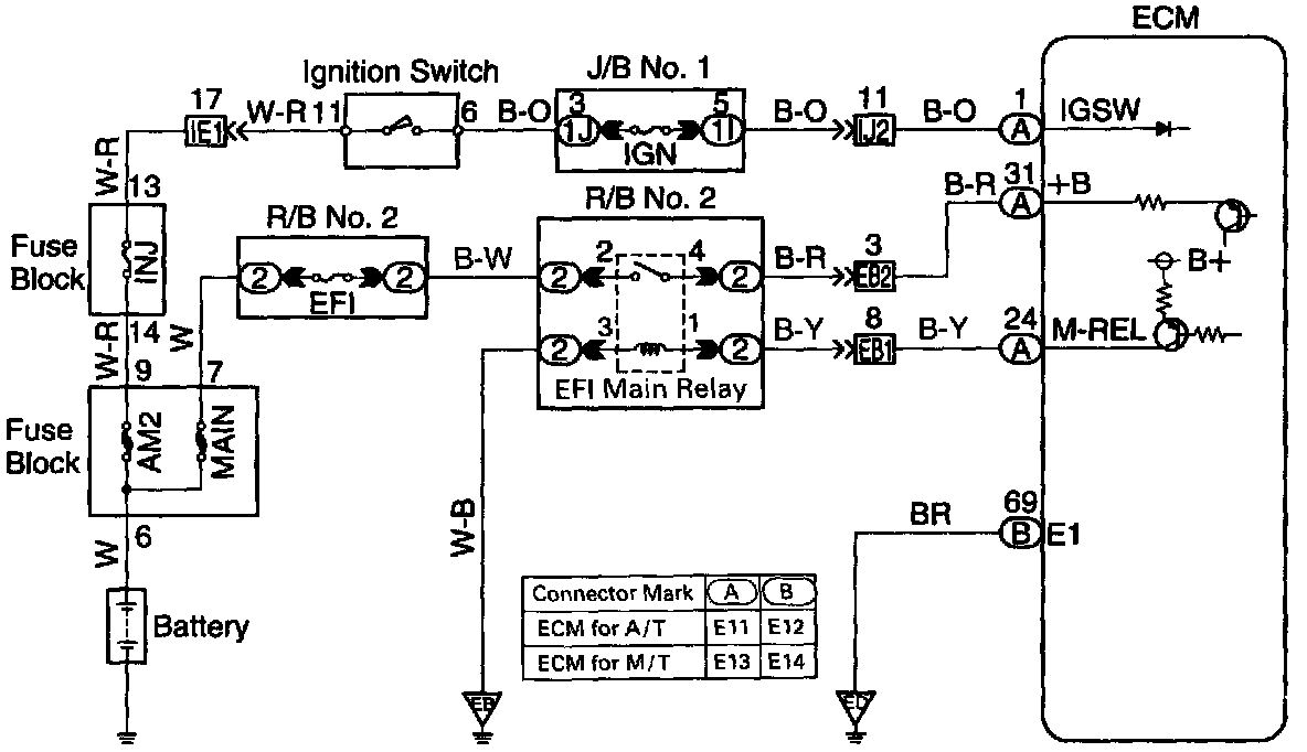 When the ignition switch is turned ON, battery positive voltage is applied to the coil, closing the contacts of the EFI main relay (Marking: EFI MAIN) and supplying power to the terminal +B of the ECM.