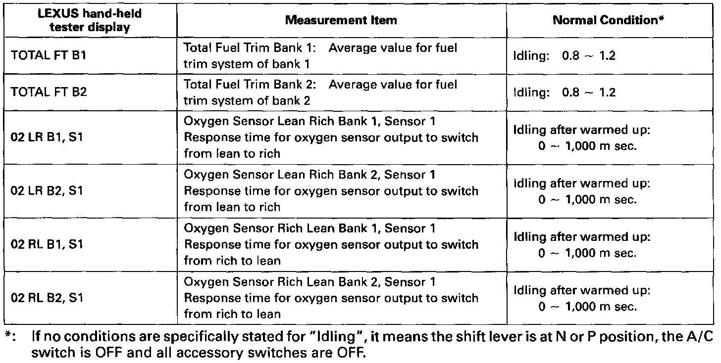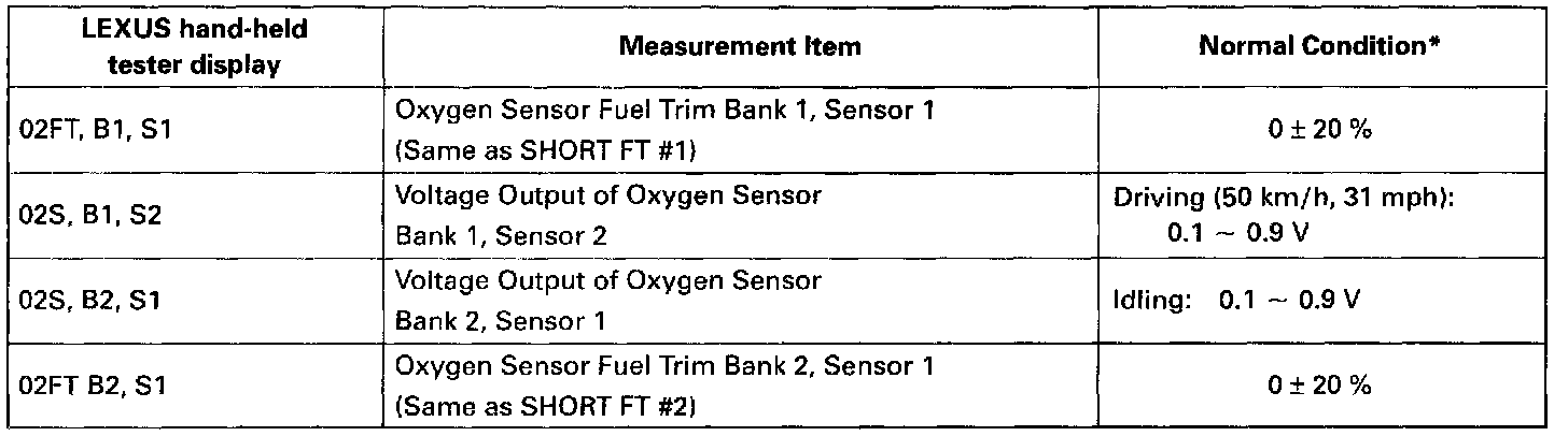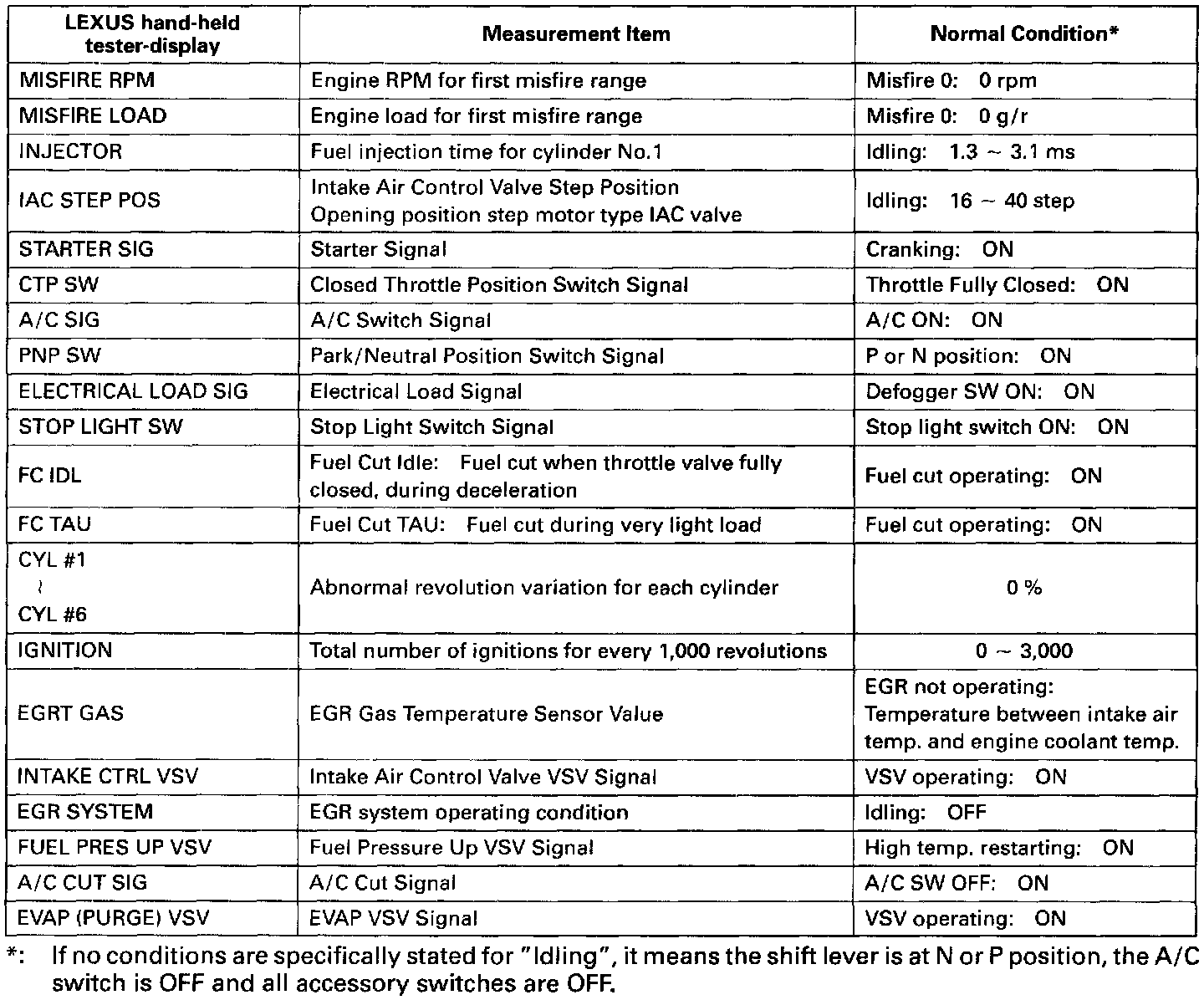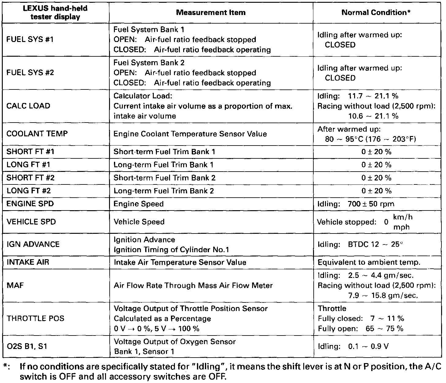 NOTICE: The values given below for "Normal Condition" are representative values, so a vehicle may still be normal even if its value varies from those listed here. So do not decide whether a part is faulty or not solely according to the "Normal Condition" here.