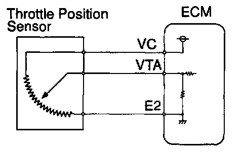When the throttle valve is fully closed, a voltage of approximately 0.7 V is applied to terminal VTA of the ECM. The voltage applied to the terminals VTA of the ECM increases in proportion to the opening angle of the throttle valve and becomes approximately 2.7 - 5.2 V when the throttle valve is fully opened.