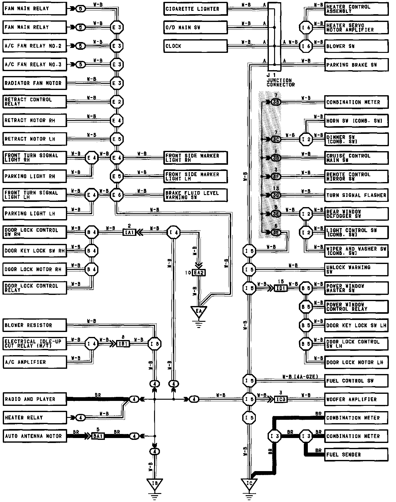 The ground points circuit diagram shows the connections from all major parts to the respective ground points. When troubleshooting a faulty ground point, checking the system circuits which use a common ground may help you identify the problem ground quickly. The relationship between ground points (EA, IB and IC shown below) can also be checked this way.
