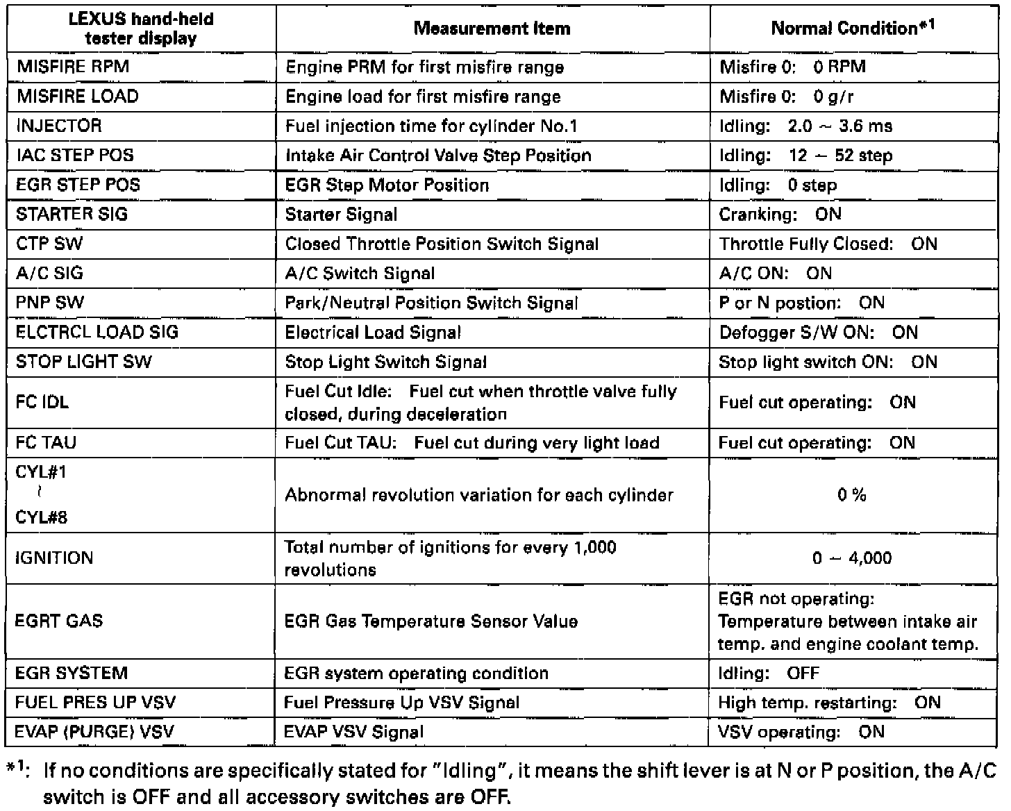 NOTICE: The values given below for "Normal Condition" are representative values, so a vehicle may still be normal even if its value varies from those listed here. So do not decide whether a part is faulty or not solely according to the "Normal Condition" here.