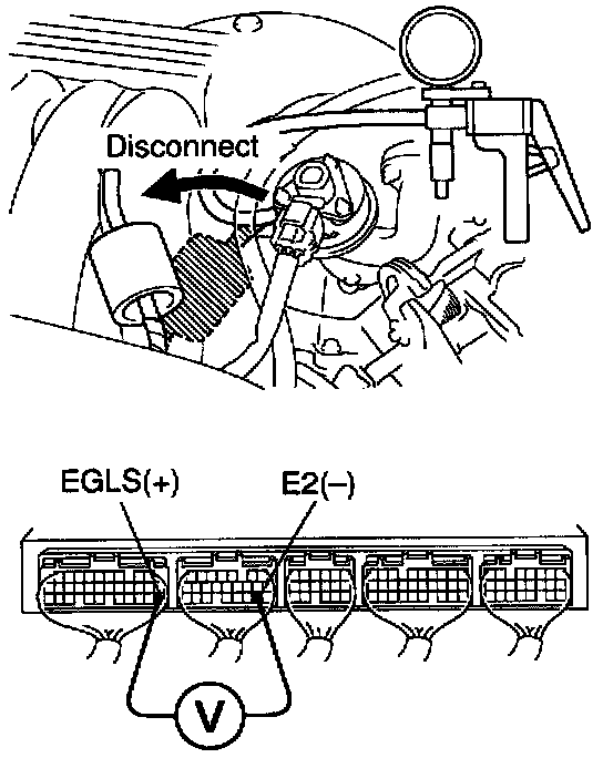 (4) Connect a voltmeter to terminals EGLS and E2 of the ECU, and measure the power outlet voltage under the following conditions:
