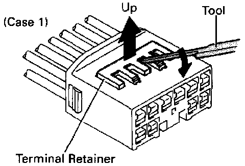 Insert the special tool into the terminal retainer access hole (Mark) and pull the terminal retainer up to the temporary lock position.