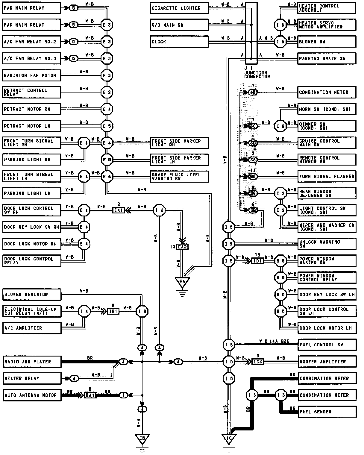 The ground points circuit diagram shows the connections from all major parts to the respective ground points. When troubleshooting a faulty ground point, checking the system circuits which use a common ground may help you identify the problem ground quickly. The relationship between ground points (EA, IB and IC shown below) can also be checked this way.