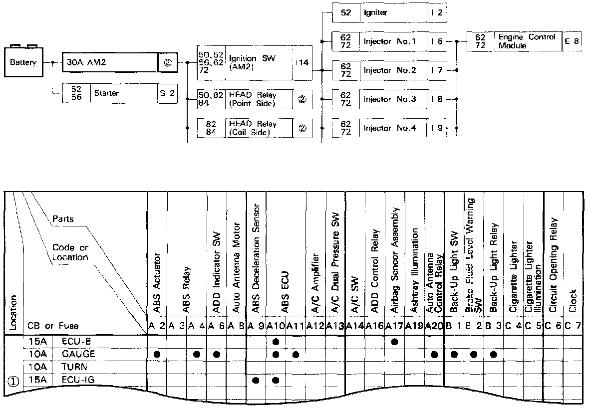 The chart above shows the route by which current flows from the battery to each electrical source (Fusible Link, Circuit Breaker, Fuse, etc.) and other parts.