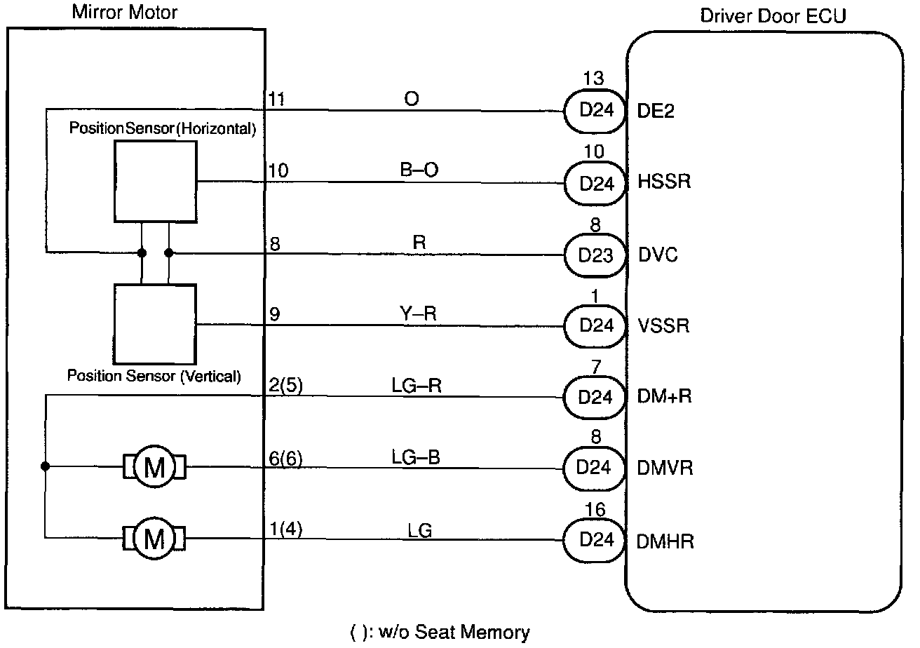 This position detected by the mirror position sensor will be memorized in the seat ECU. This sensor is equipped in the mirror in spite of the existence of the memory function.