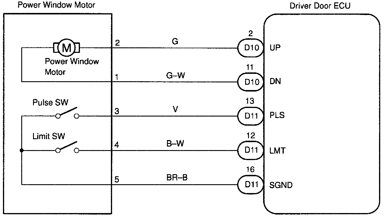 Jam protection limit switch is built-in the power window motor. This switch functions to turn "OFF" before the top dead center, and ECU reads this "OFF" signal resulting in closing the window fully.