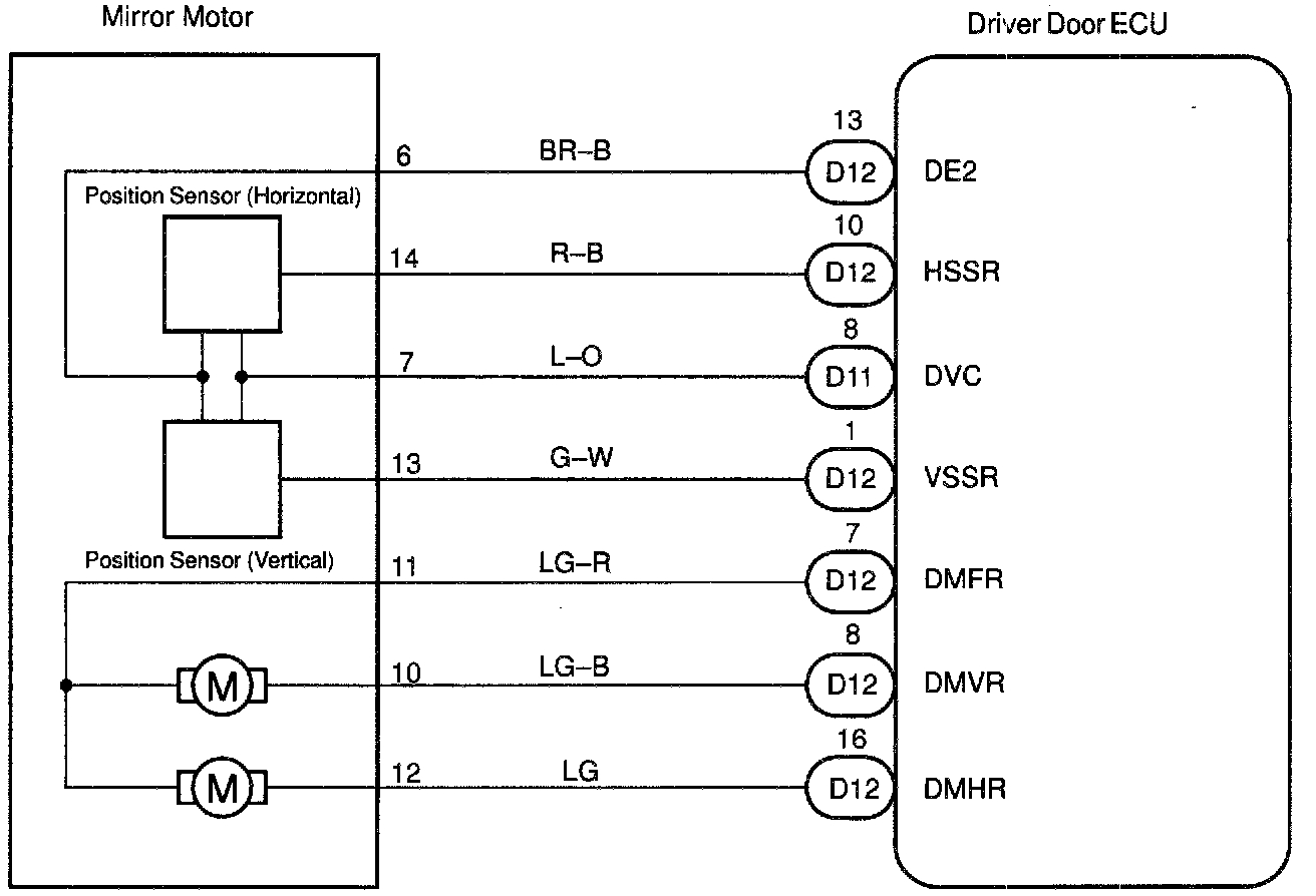 This position detected by the mirror position detection sensor will be memorized in the seat ECU. This sensor is equipped in the mirror in spite of the existence of the memory function.