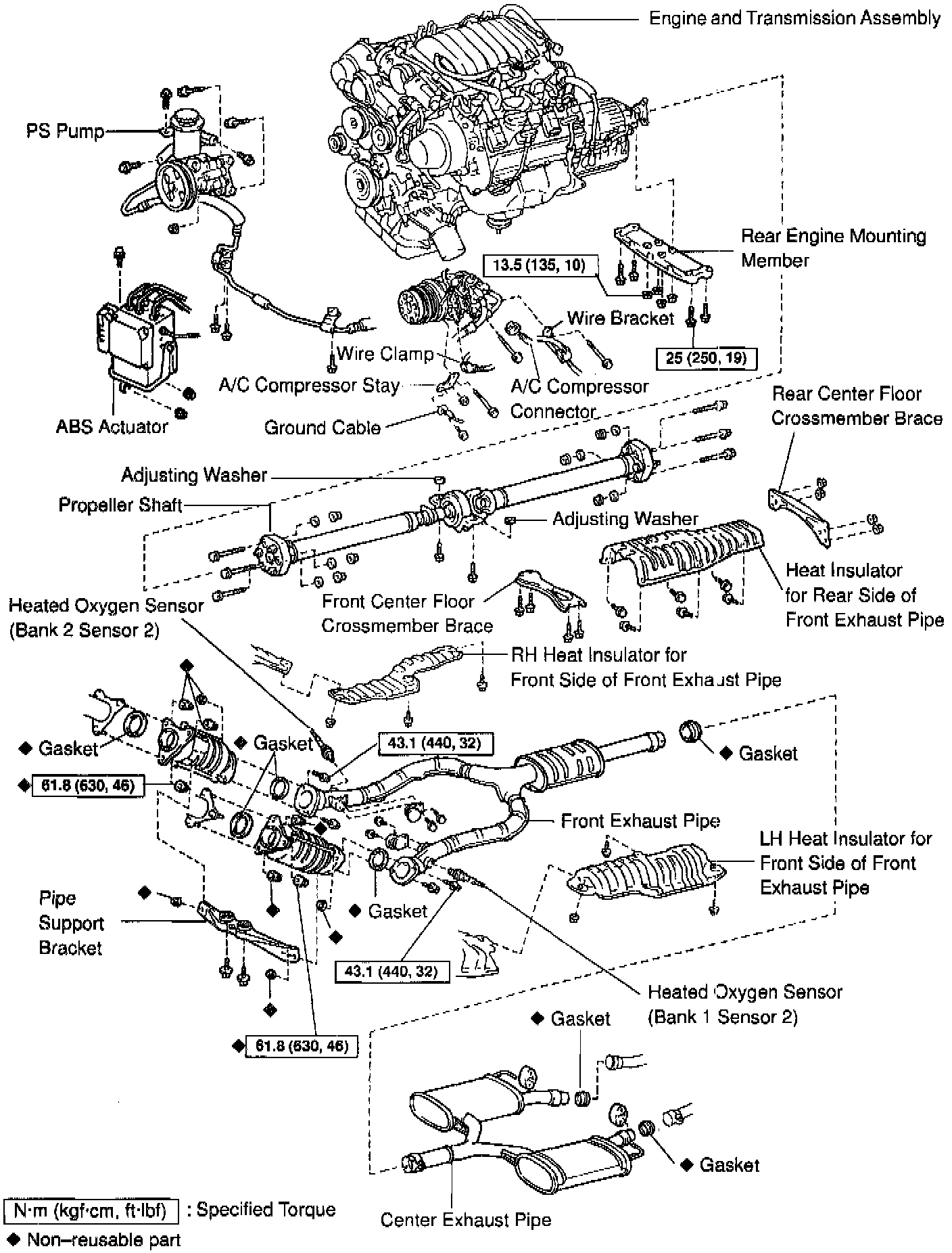 ENGINE, FRONT EXHAUST PIPES AND CROSSMEMBER
