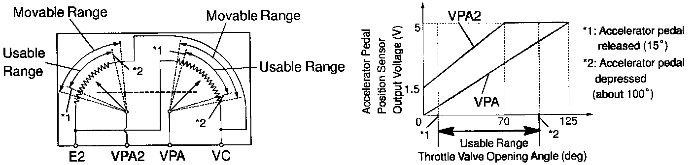 The accelerator pedal position sensor is connected with the accelerator pedal by the accelerator wire and the voltage applied to the terminals VPA and VPA2 of the ECM changes between 0 V and 5 V in proportion to the opening angle of the accelerator pedal.