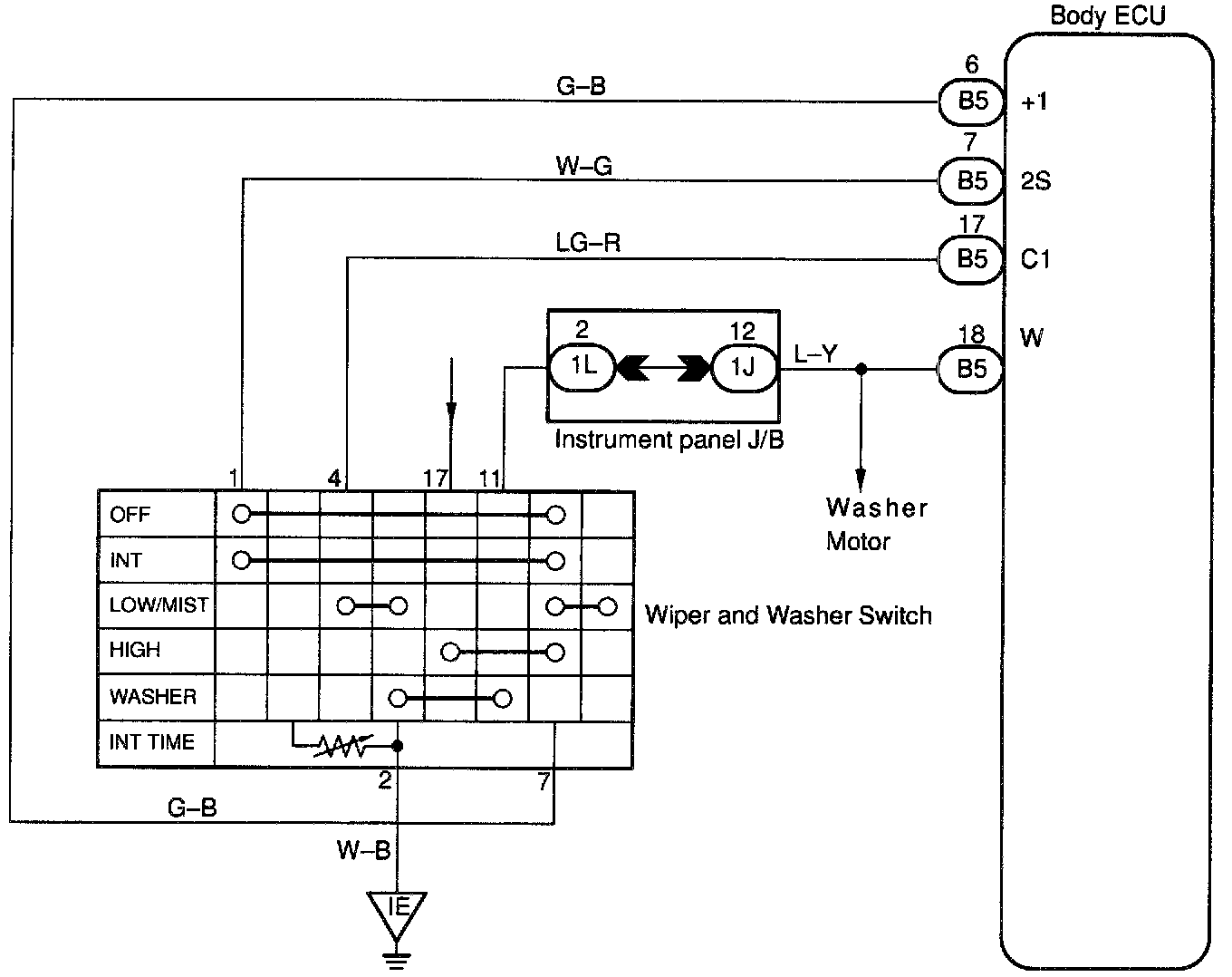 Body ECU judges the switch position with the terminal voltage of the wiper and washer switch and runs the wiper motor.