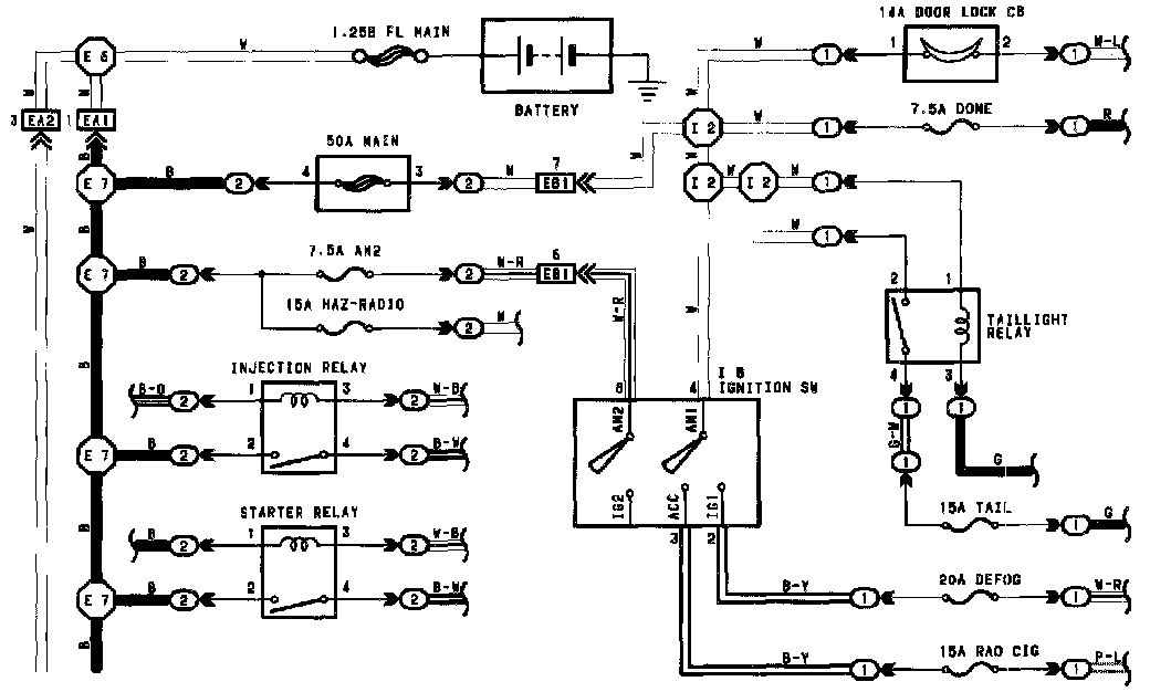 The chart shows the route by which current flows from the battery to each electrical source (Fusible Link, Circuit Breaker, Fuse, etc.) and other parts.