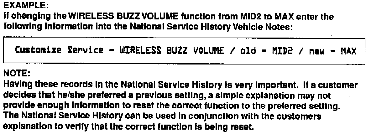 2. When customizing, a detailed description including the "Item Selected", the old setting, and the new setting must be entered into the Lexus National Service History as a vehicle note.