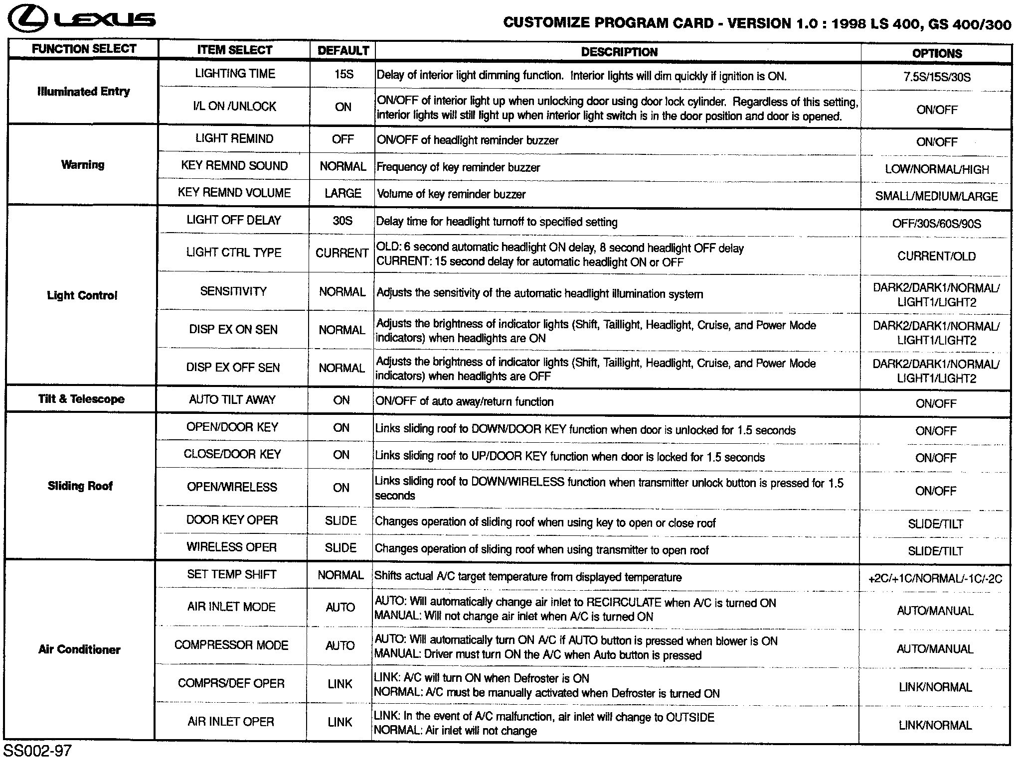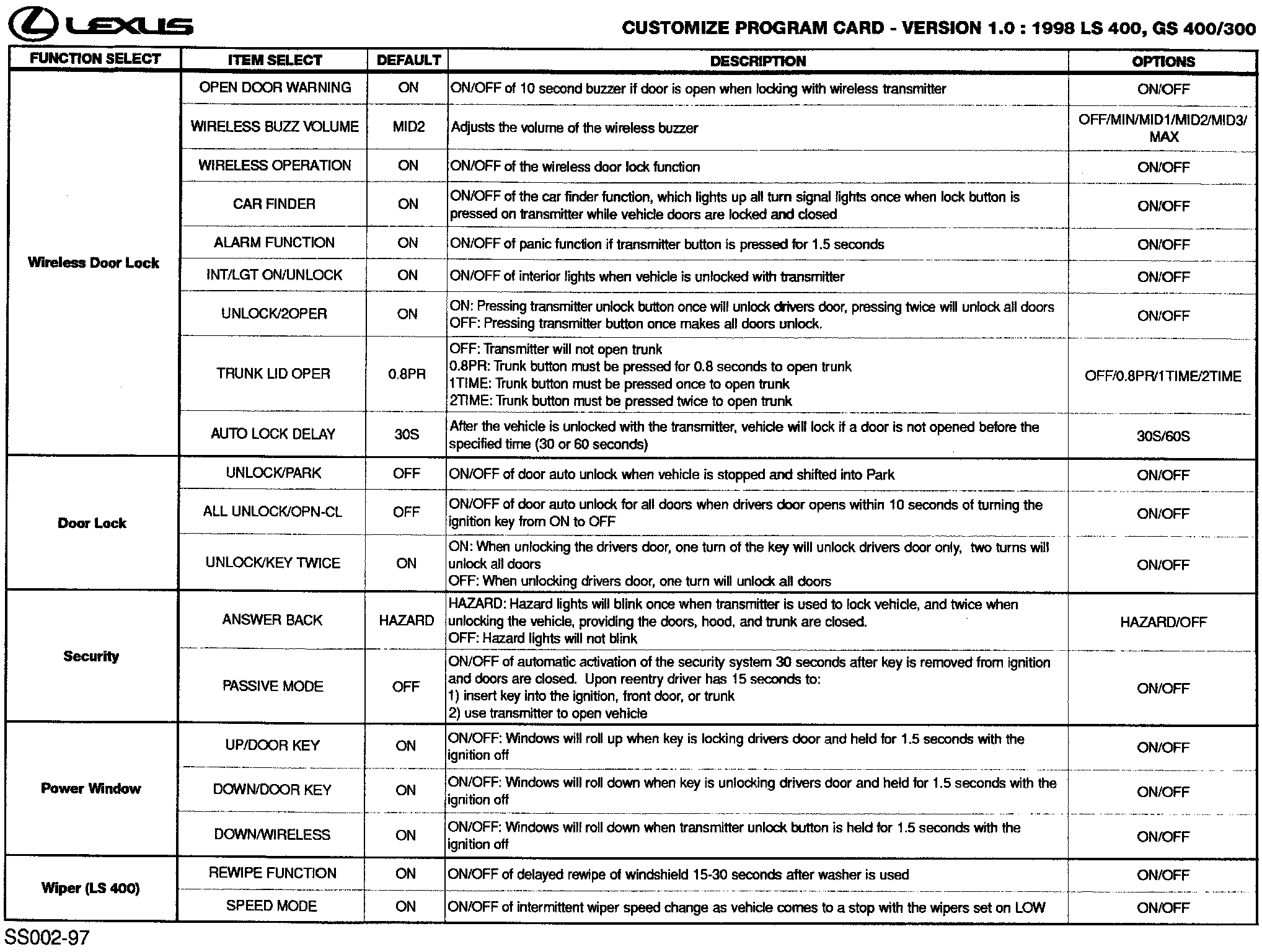 The Customize Program Card for the Lexus Diagnostic Tester allows Lexus Dealers to customize many of the electrical functions on LS 400 and GS 400/300 vehicles to match individual customer desires. This bulletin will provide you with a comprehensive list of available features for customization.