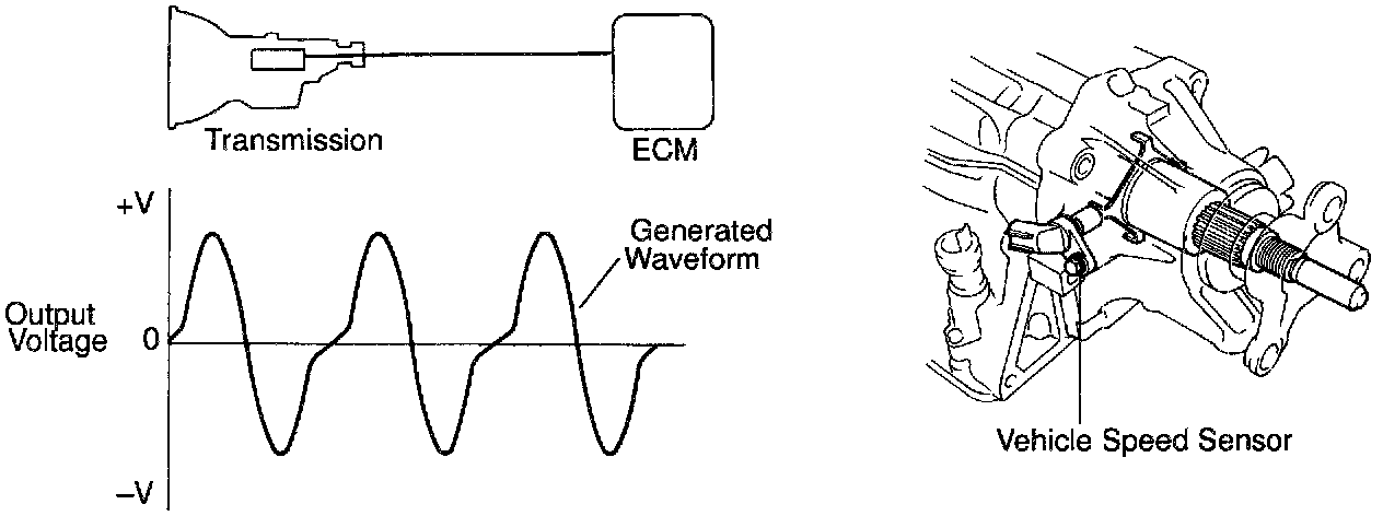The vehicle speed sensor detects the rotation speed of the transmission output shaft and sends signals to the ECM. The ECM determines the vehicle speed based on these signals. An AC voltage is generated in the vehicle speed sensor coil as the rotor mounted on the output shaft rotates, and this voltage is sent to the ECM.