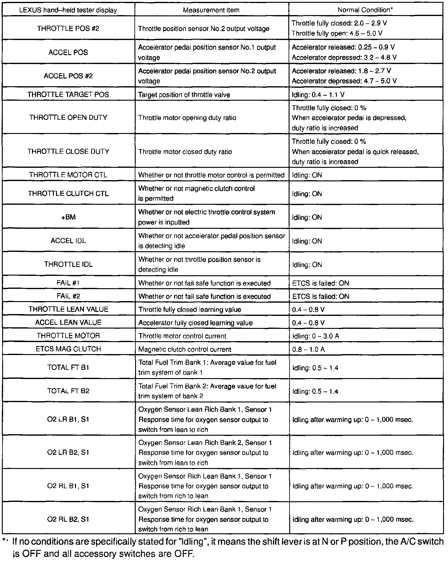 NOTICE: The values given below for "Normal Condition" are representative values, so a vehicle may still be normal even if its value varies from those listed here. So do not decide whether a part is faulty or not solely according to the "Normal Condition" here.