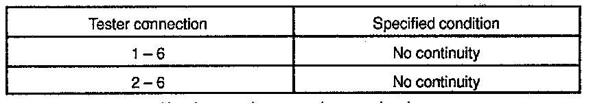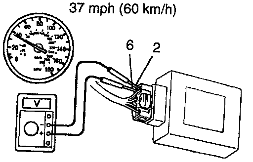 2) Place the transmission in gear and while running at about 37 mph (60 km/h), measure the voltage between ECU terminals 2 and 6.