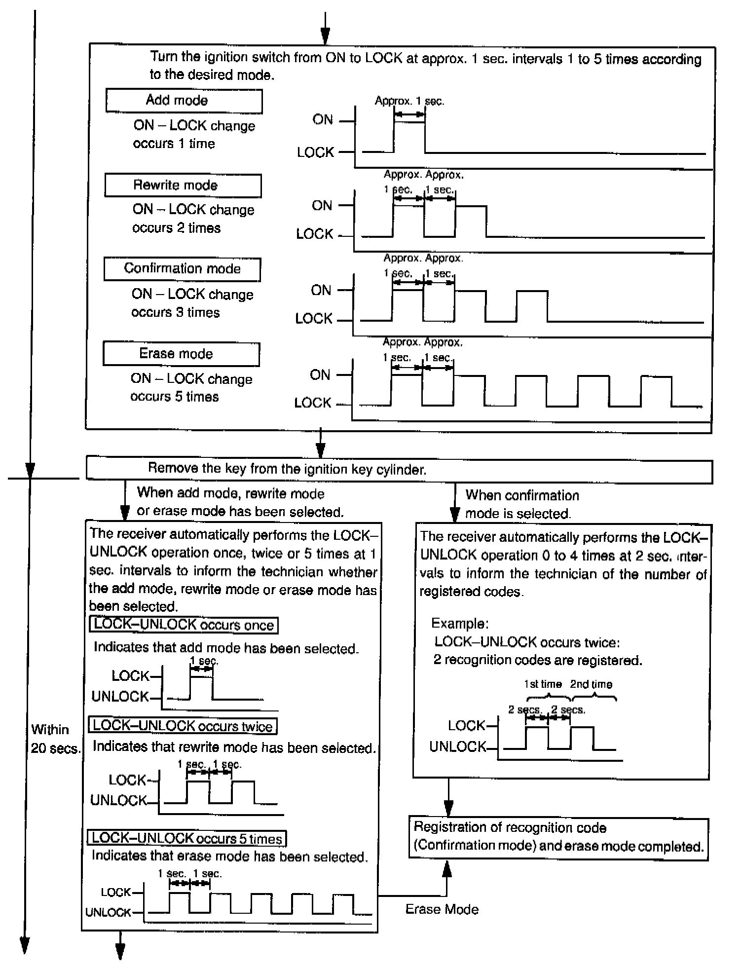 - The rewrite mode is used to erase all previous registered codes before registering new recognition codes. This mode is used before registering new transmitter or wireless door lock ECU.
