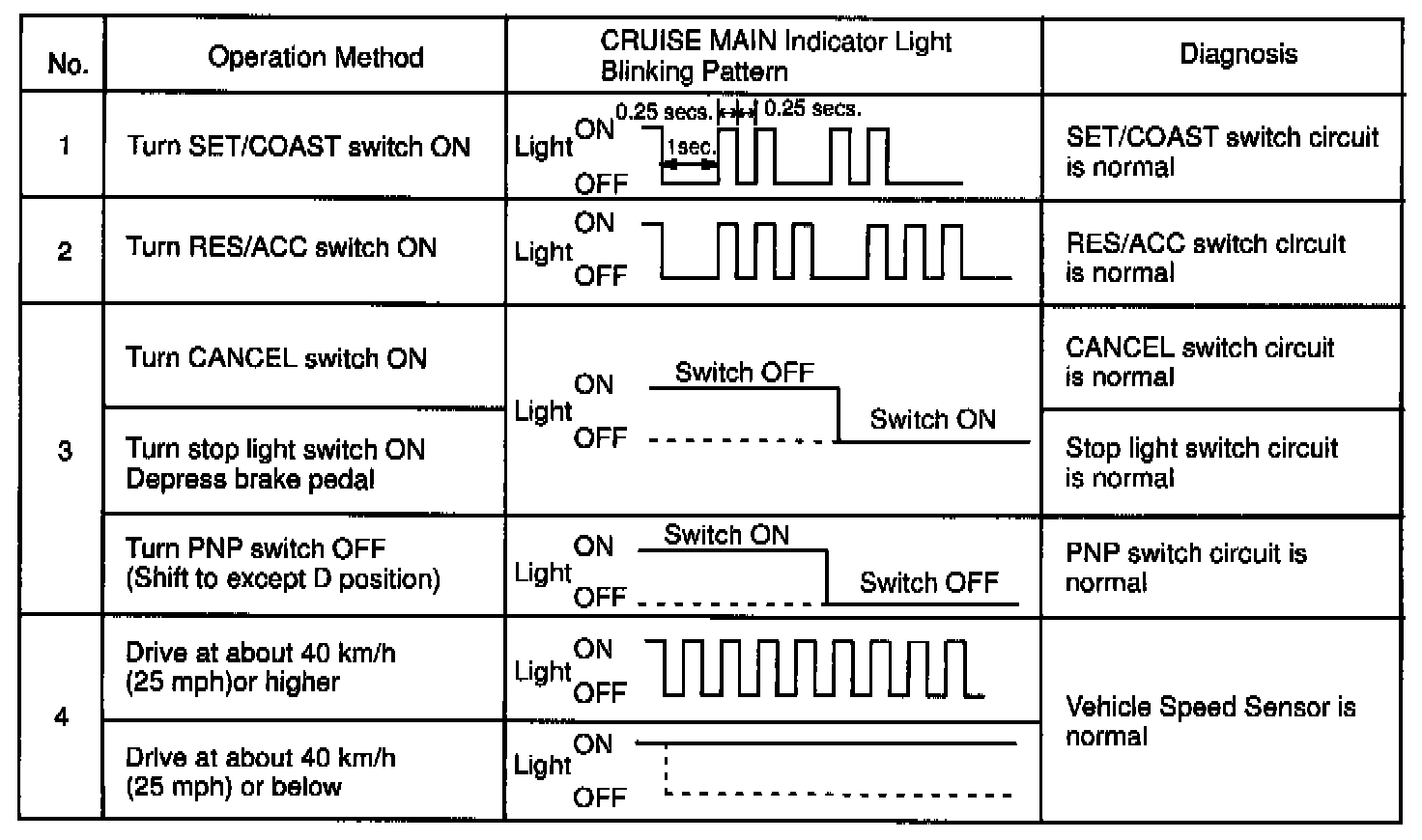 f. Read the blinking pattern of the CRUISE MAIN indicator light.