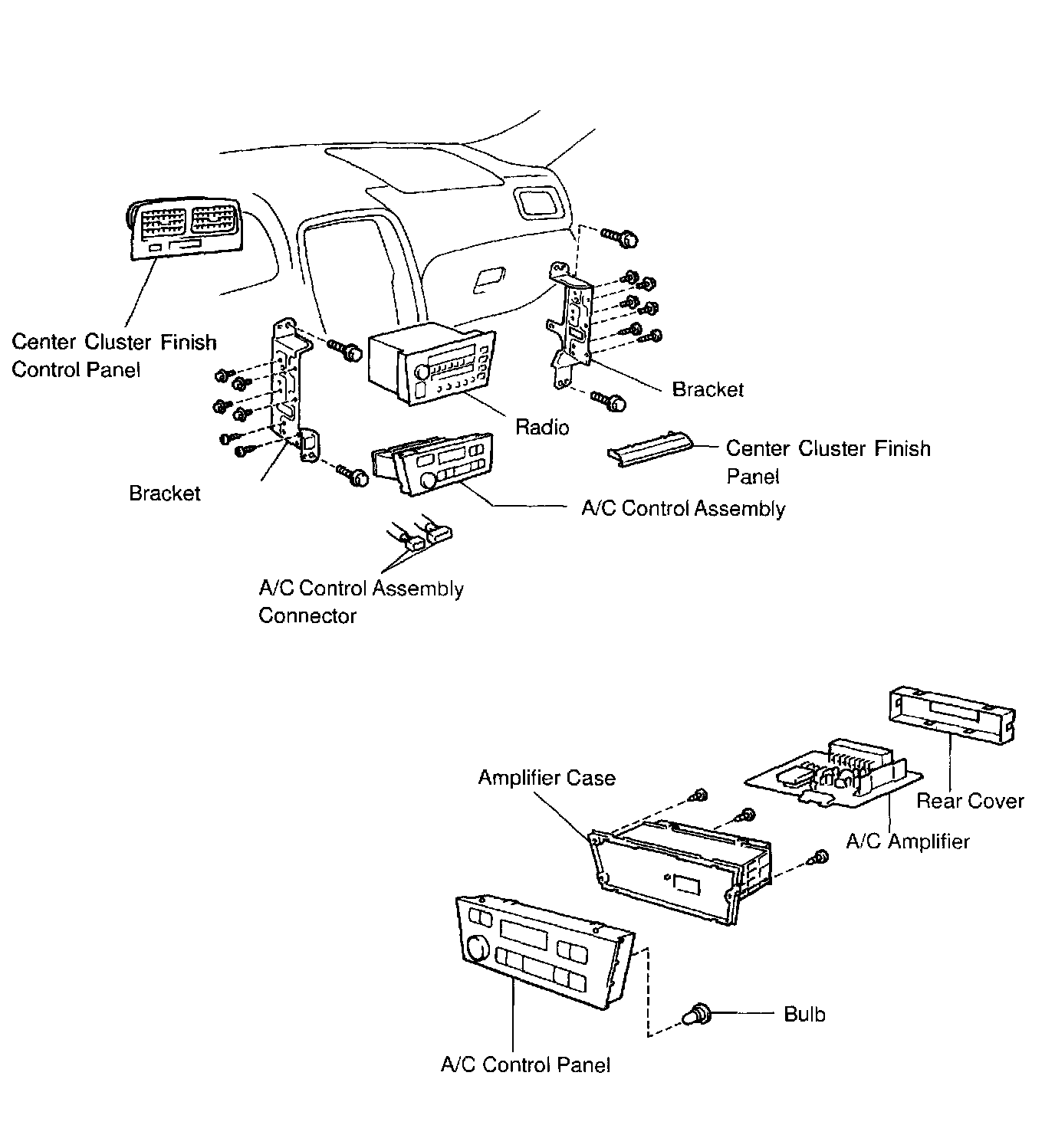 a. Remove the 4 bolts and pull out the A/C control assembly with radio, then disconnect the connectors.