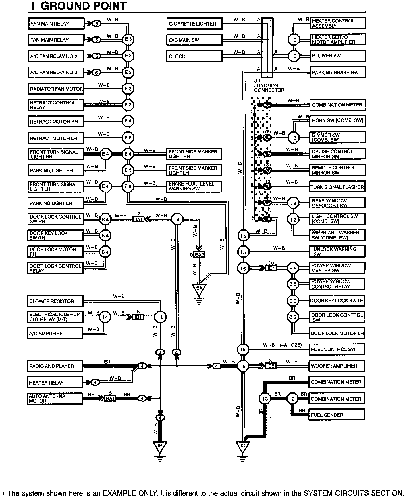 The ground points circuit diagram shows the connections from all major parts to the respective ground points. When troubleshooting a faulty ground point, checking the system circuits which use a common ground may help you identify the problem ground quickly. The relationship between ground points (EA, IB and IC shown below) can also be checked this way.