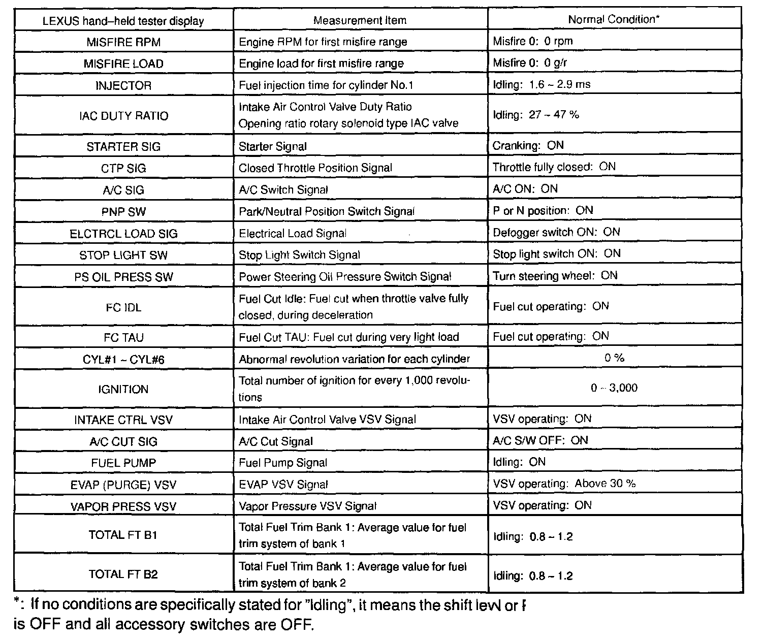 ENGINE OPERATING CONDITIONNOTE: The values given for "Normal Condition" are representative values, so a vehicle may still be normal even if its value varies from those listed here. So do not decide whether a part is faulty or not solely according to the "Normal Condition" here.