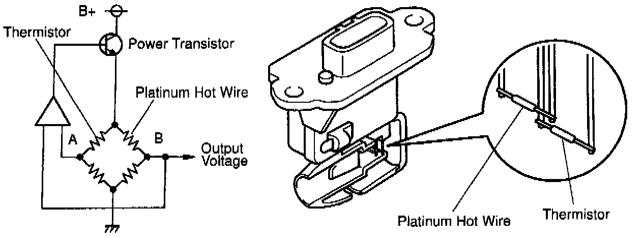 The mass air flow meter uses a platinum hot wire. The hot wire air flow meter consists of a platinum hot wire, thermistor and a control circuit installed in a plastic housing. The hot wire air flow meter works on the principle that the hot wire and thermistor located in the intake air bypass of the housing detect any changes in the intake air temperature.