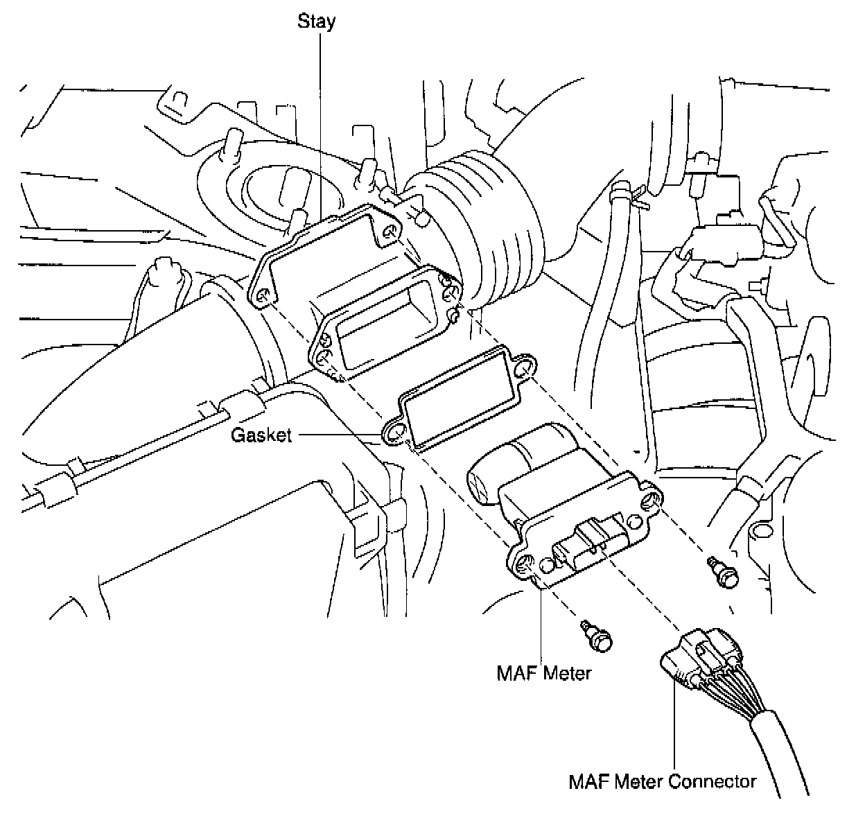 b. Remove the 2 bolts, MAF meter, gasket and stay.