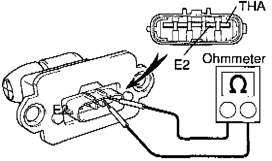 Using an ohmmeter, measure the resistance between terminals THA and E2. If the resistance is not as specified, replace the MAF meter.