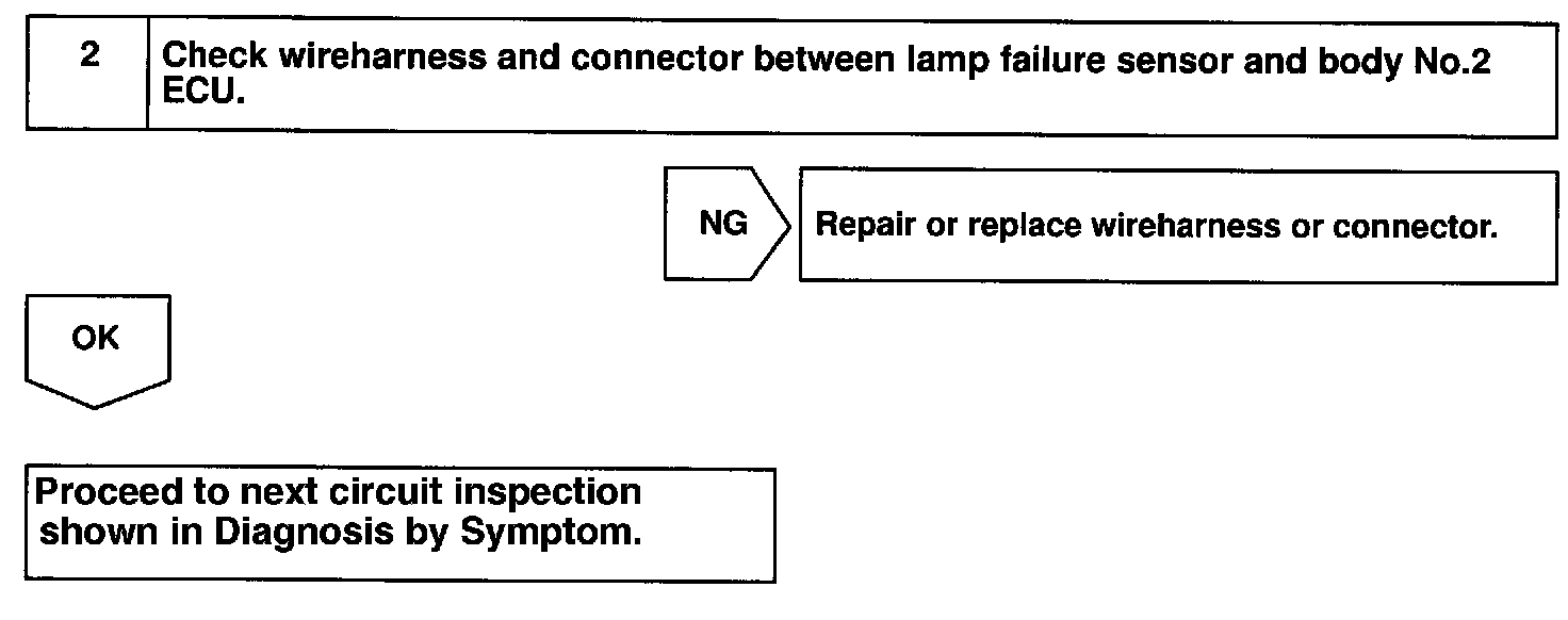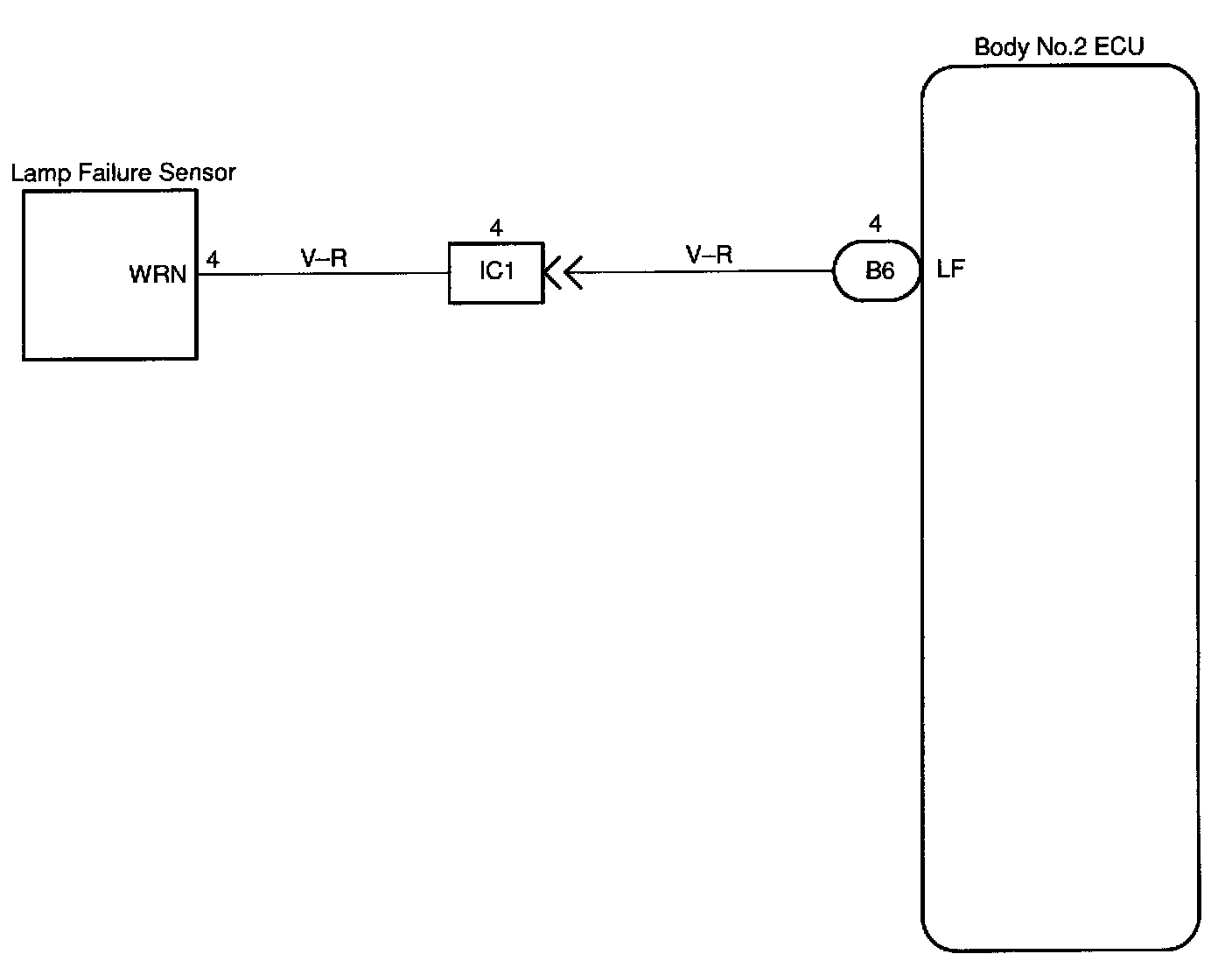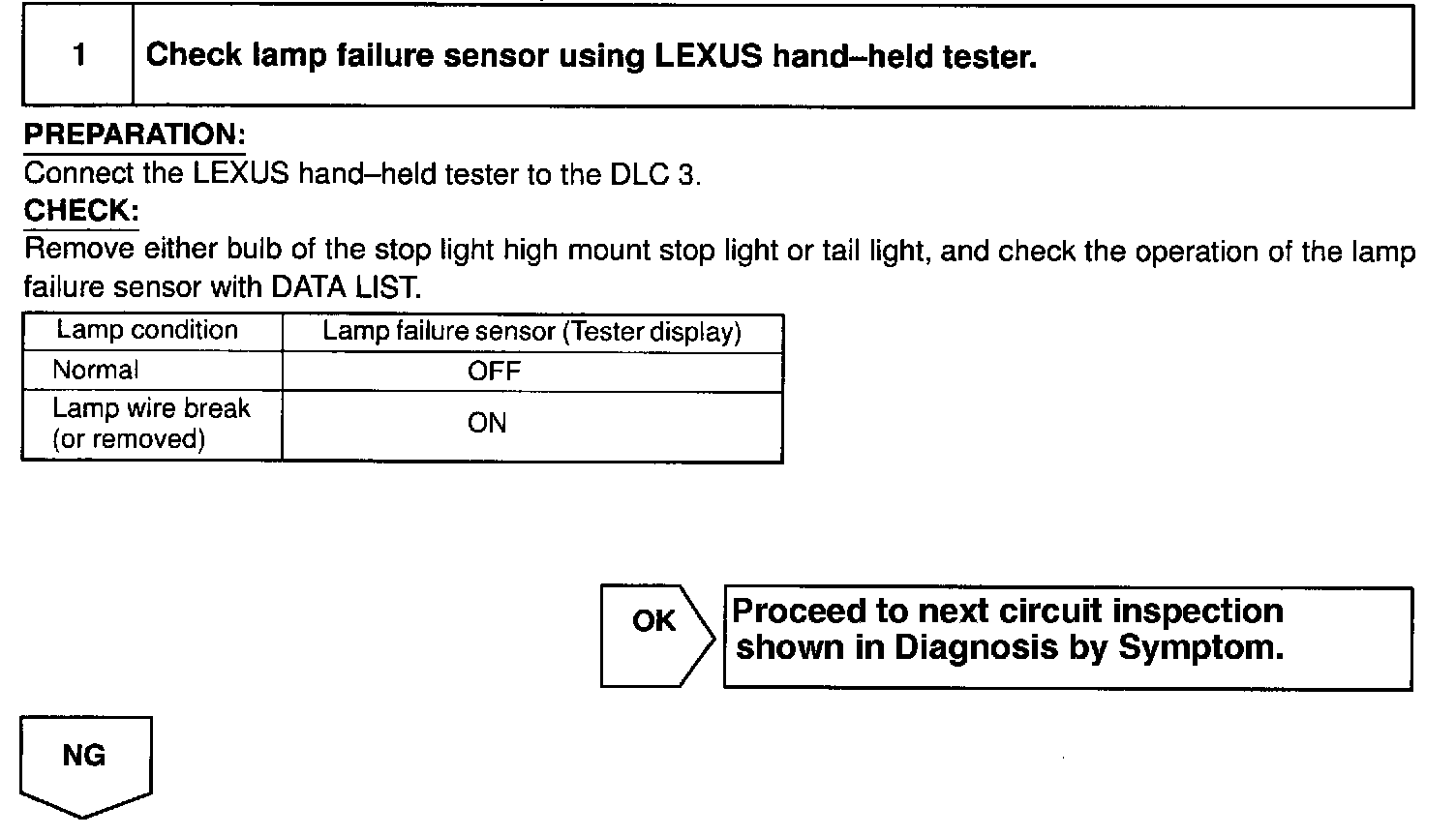 CIRCUIT DESCRIPTIONLamp failure sensor detects a wire break of the stop light high mount stop light and tail light and sends that signal to the Body No.2 ECU.