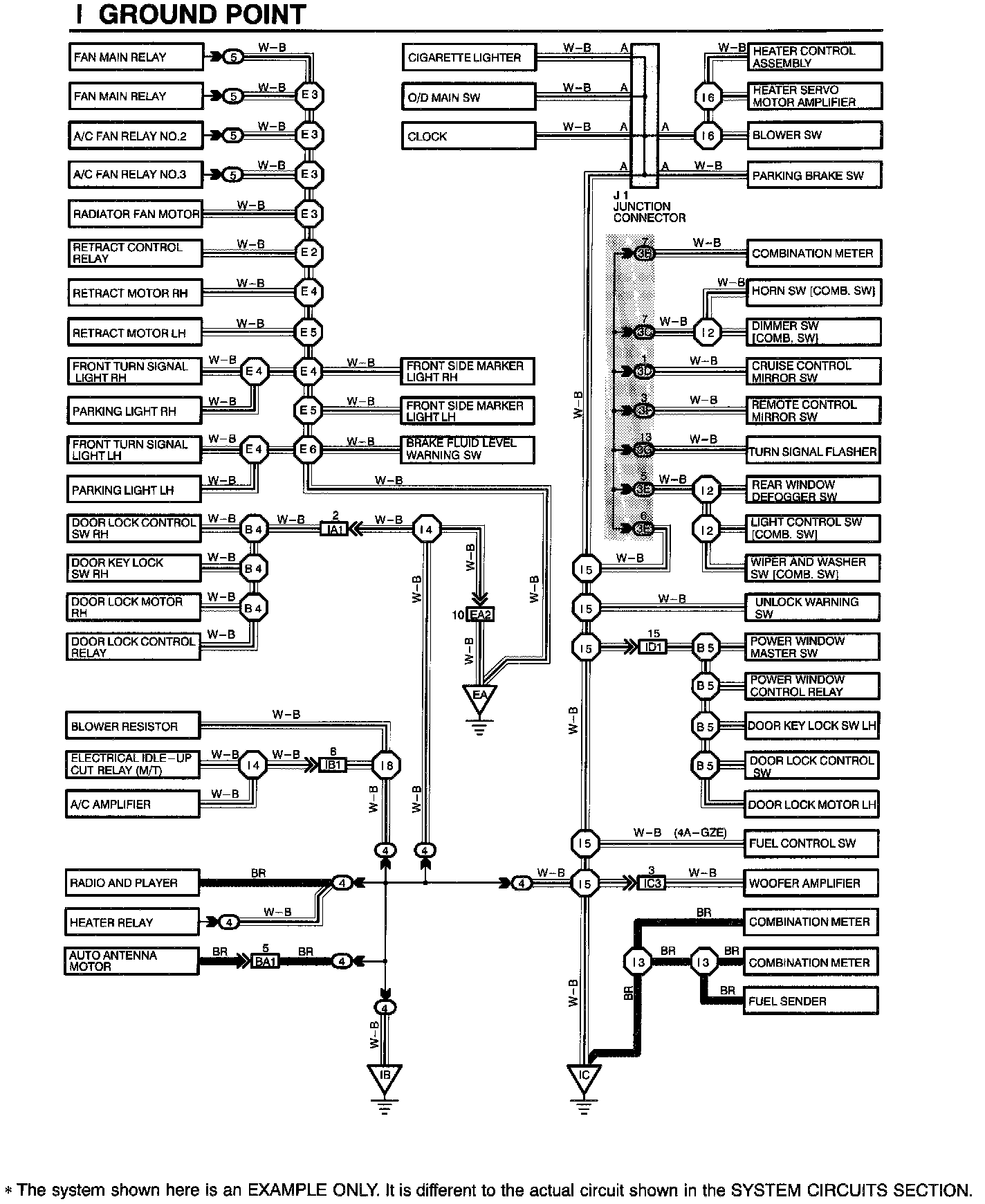The ground points circuit diagram shows the connections from all major parts to the respective ground points. When troubleshooting a faulty ground point, checking the system circuits which use a common ground may help you identify the problem ground quickly. The relationship between ground points (EA, IB and IC shown below) can also be checked this way.