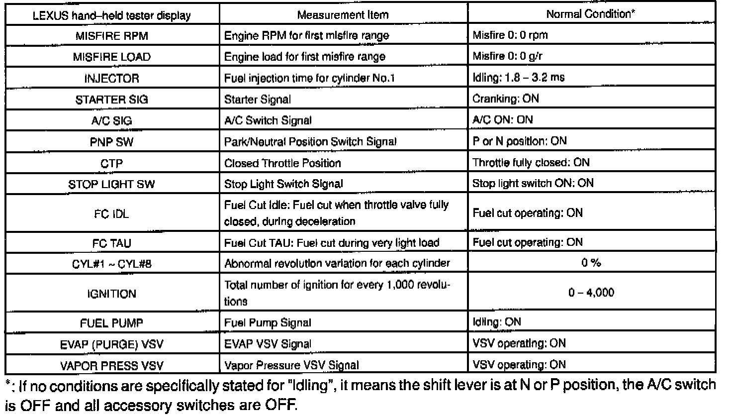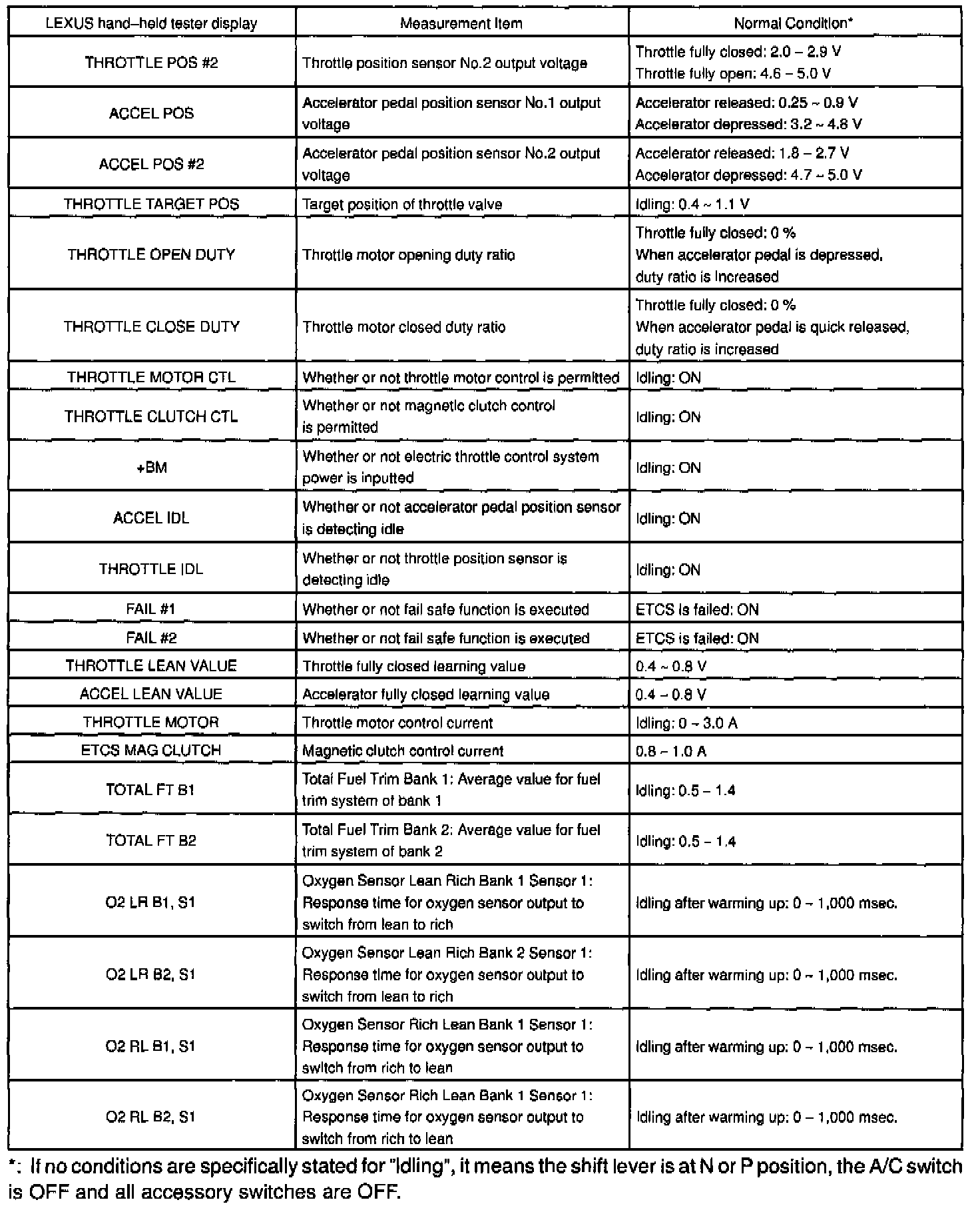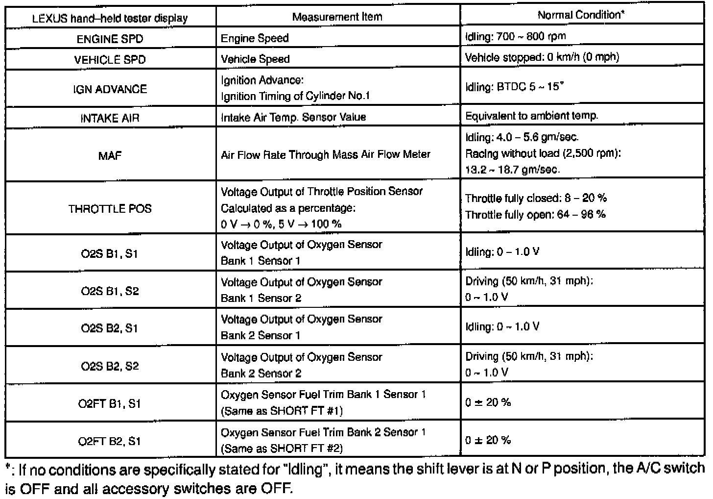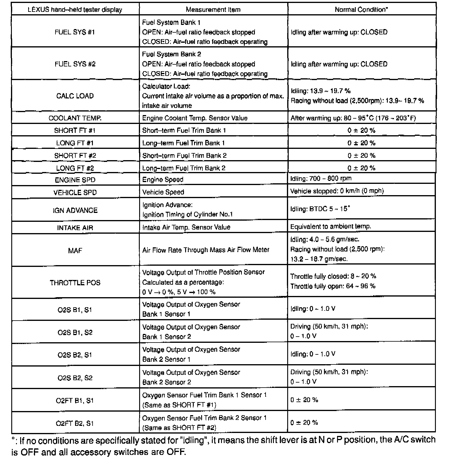NOTE: The values given below for "Normal Condition" are representative values, so a vehicle may still be normal even if its value varies from those listed here. So do not decide whether a part is faulty or not solely according to the "Normal Condition" here.Part 2 Of 2: