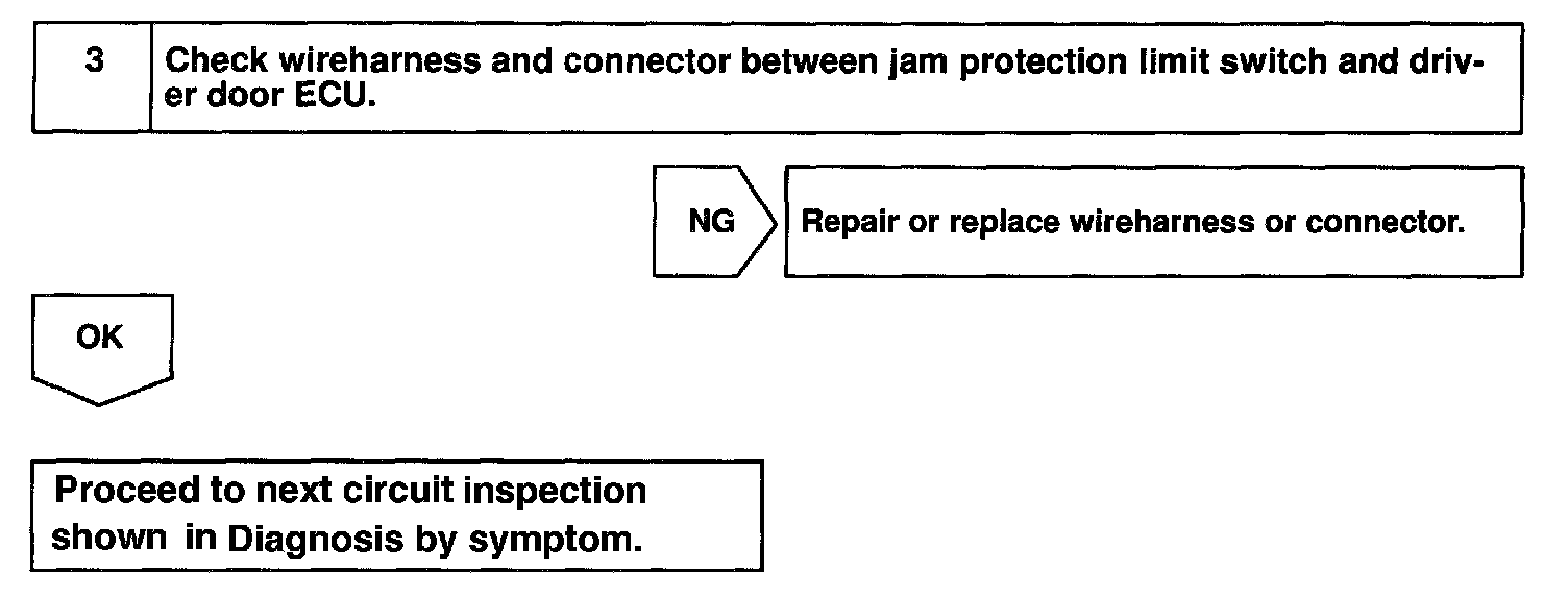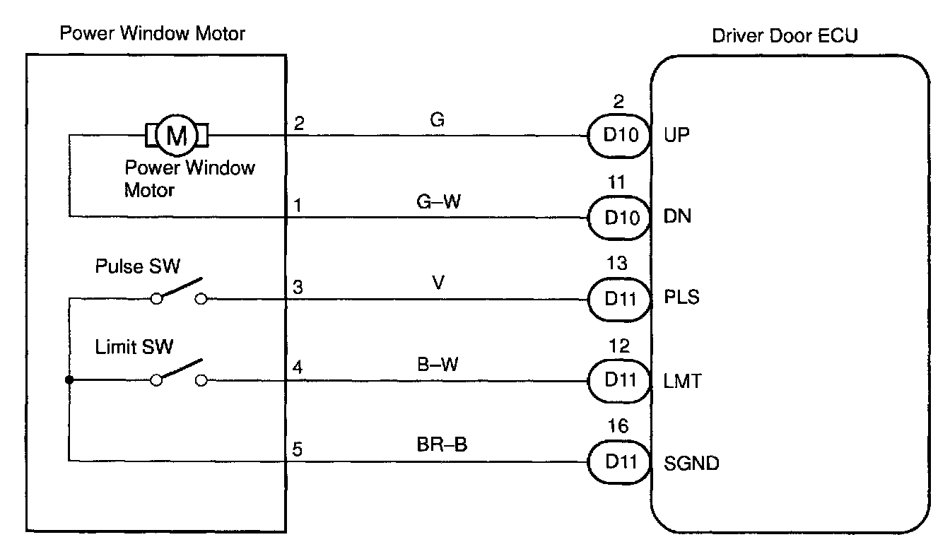 CIRCUIT DESCRIPTIONJam protection limit switch is built-in the power window motor. This switch functions to turn "OFF" before the top dead center, and ECU reads this "OFF" signal resulting in closing the window fully.