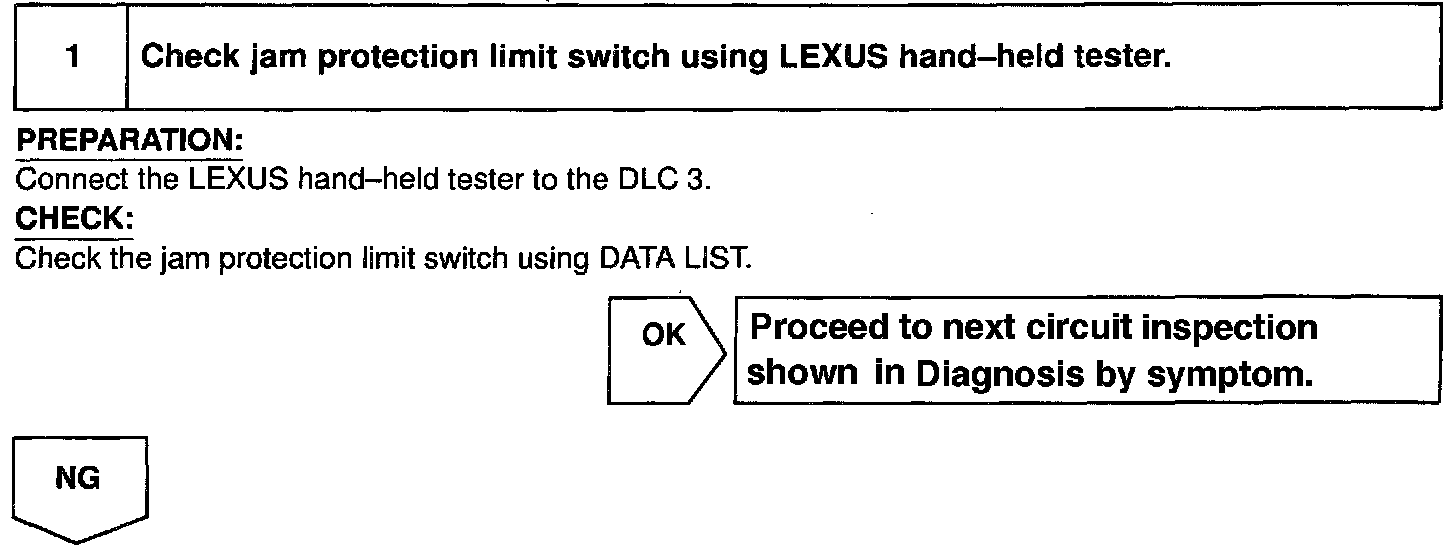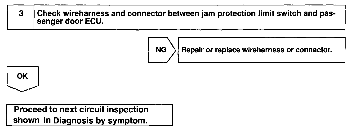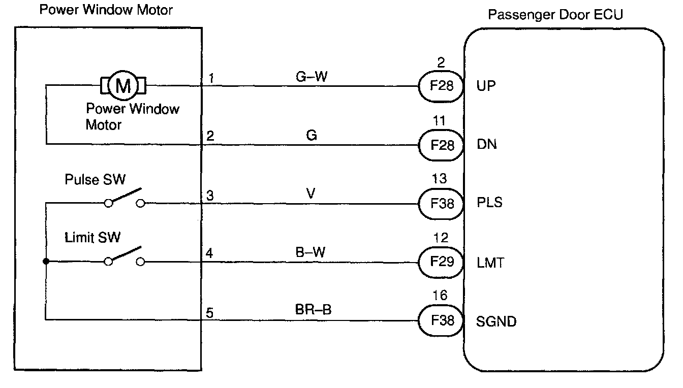 CIRCUIT DESCRIPTIONJam protection limit switch is built-in the power window motor. This switch functions to turn "OFF" before the top dead center, and ECU reads this "OFF" signal resulting in closing the window fully.